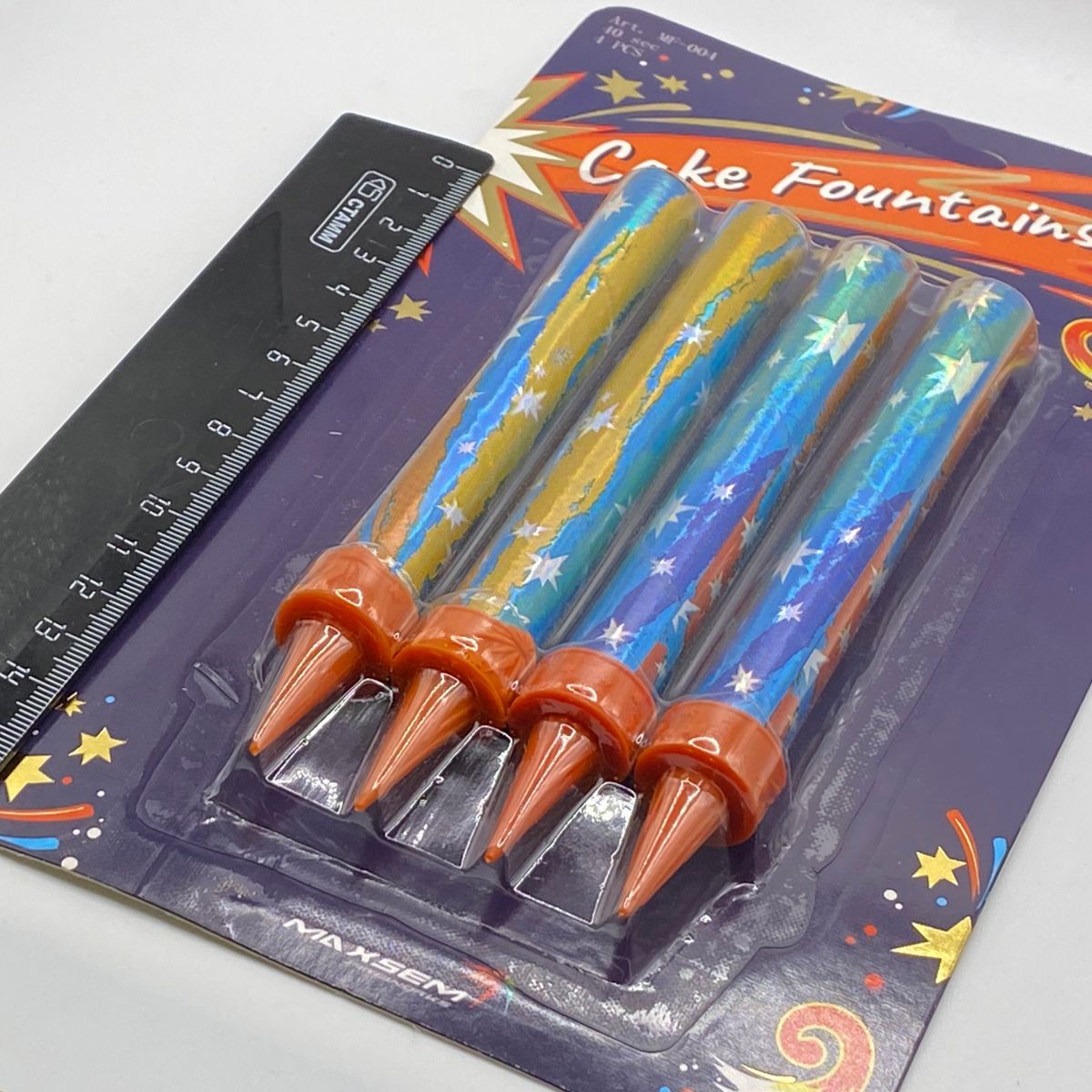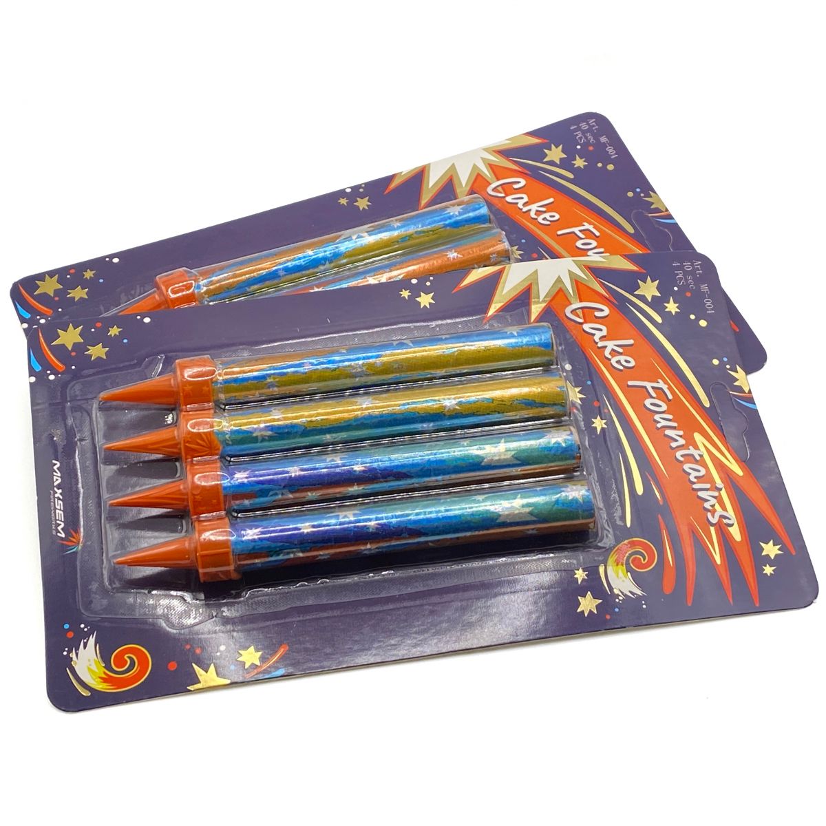 Классический фейерверк для торта представляет собой небольшую "палочку" длиной 12 см, на одной стороне которого укреплен пластмассовый шип - этой стороной изделие нужно втыкать в торт. После это поджигаете противоположный край изделия - никакого фитиля нет, просто держите зажигалку или спичку около фонтана. Принцип такой же, как при зажигании бенгальской свечи. Соблюдайте осторожность! Фонтан выпускает поток "холодных" искр (температура горения - около 35 градусов) высотой порядка полуметра, продолжительность горения - от 30 до 40 секунд. Упаковка содержит 4 фонтана в торт. Мы рекомендуем эту модель фонтана в торт для небольших тортов, для семейных праздников. Для более крупных мероприятий требуются фонтаны в торт большего размера с большей продолжительностью горения, рассчитанной на то, что фонтаны зажигаются и затем торт торжественно выносится в зал. Изделие является малодымным, подходит для использования в городской квартире. Внимание! Цвет самих палочек может быть различным. Разноцветные искры (красный, зеленый, синий, желтый).