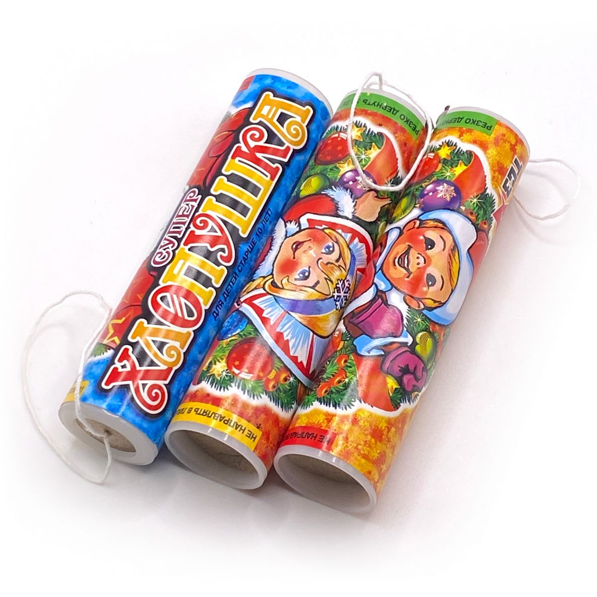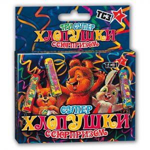 Каждая упаковка состоит из трех ярких хлопушек с изображением сказочных героев: медвежонка, зайчонка и белочки. Красочные картинки обязательно понравятся детям, как и громкие хлопки с выбрасыванием разноцветного конфетти. В качестве сюрприза внутри хлопушек лежат маленькие игрушки.