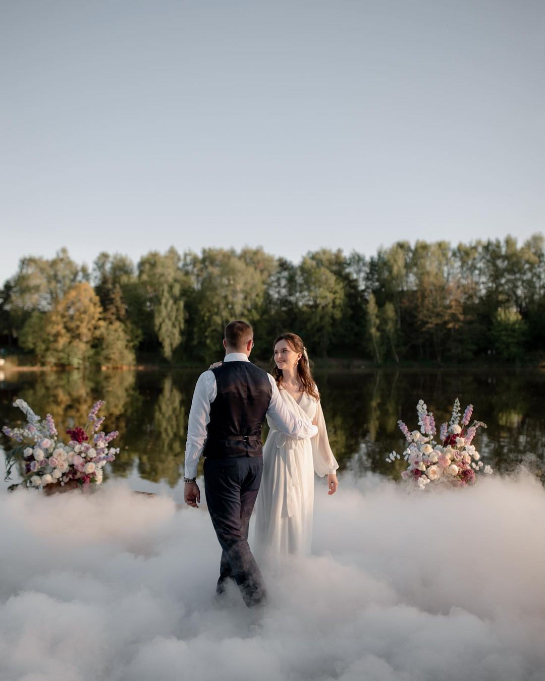 Тяжелый дым на свадьбу - это волшебная прогулка по густым облакам, ощущение отрыва от земли и полета. Оставаясь в душе ребенком, взрослые в предвкушении праздника мечтают попасть в сказочную атмосферу. Тяжелый сценический дым - прекрасный выбор для первого танца молодоженов, он обеспечит потрясающий, неземной эффект. Дым не поднимается на верх под тяжестью воздуха, а так и остается под ногами. Плотные, густые облака сценического дыма стелются по земле, создавая у присутствующих гостей ощущение нереальности происходящего. Клубы белого дыма одновременно похожи на кучевые облака, и на морскую пену, и на бурлящую горную реку.