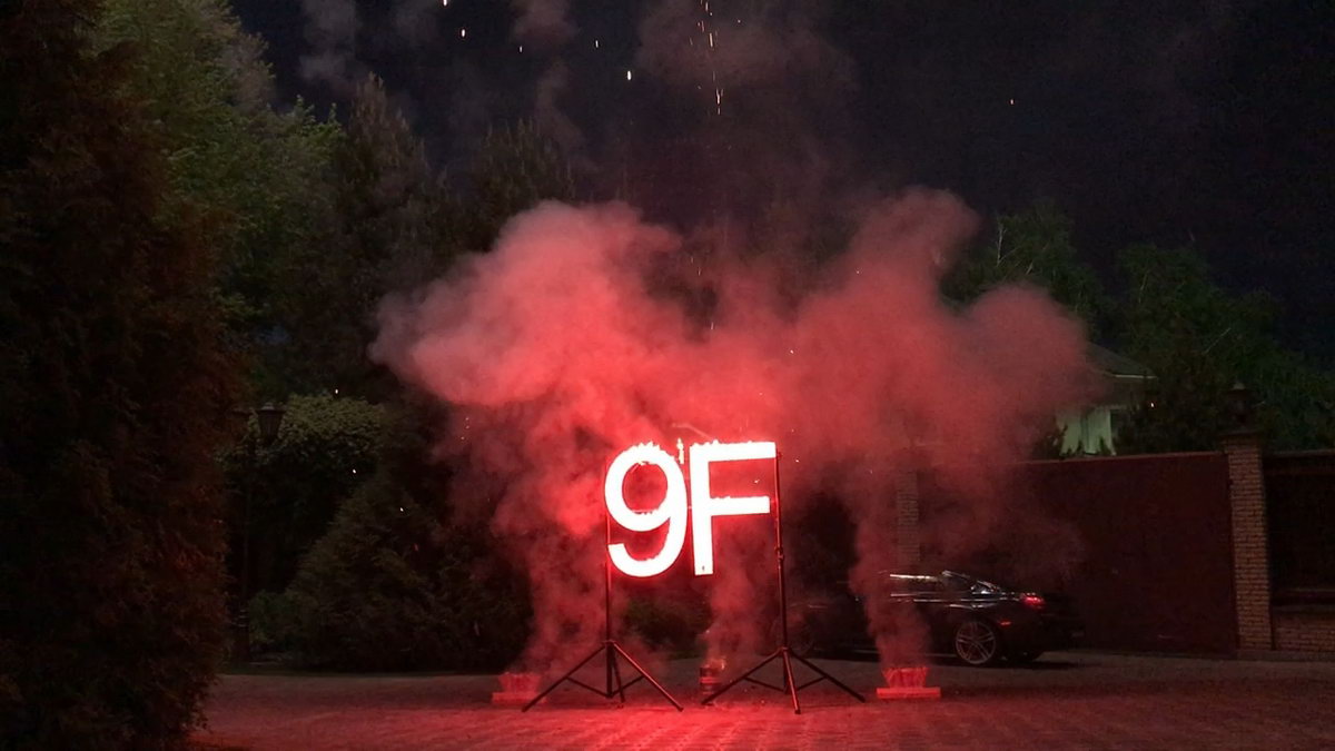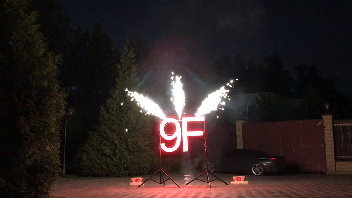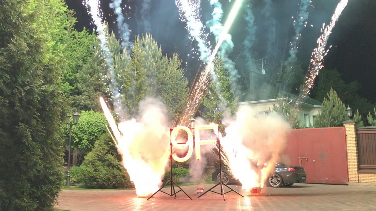Наземный фейерверк: горящее сердце и две буквы, пиротехнические вертушки «колесо» (2 шт. по 6 элементов), сценические фонтаны (6 шт.)
