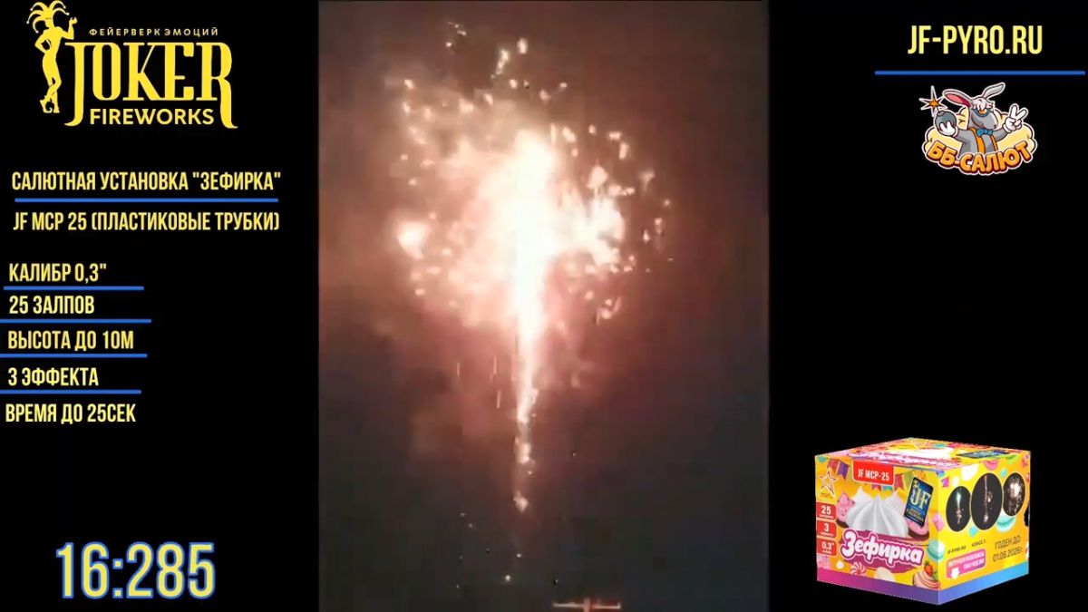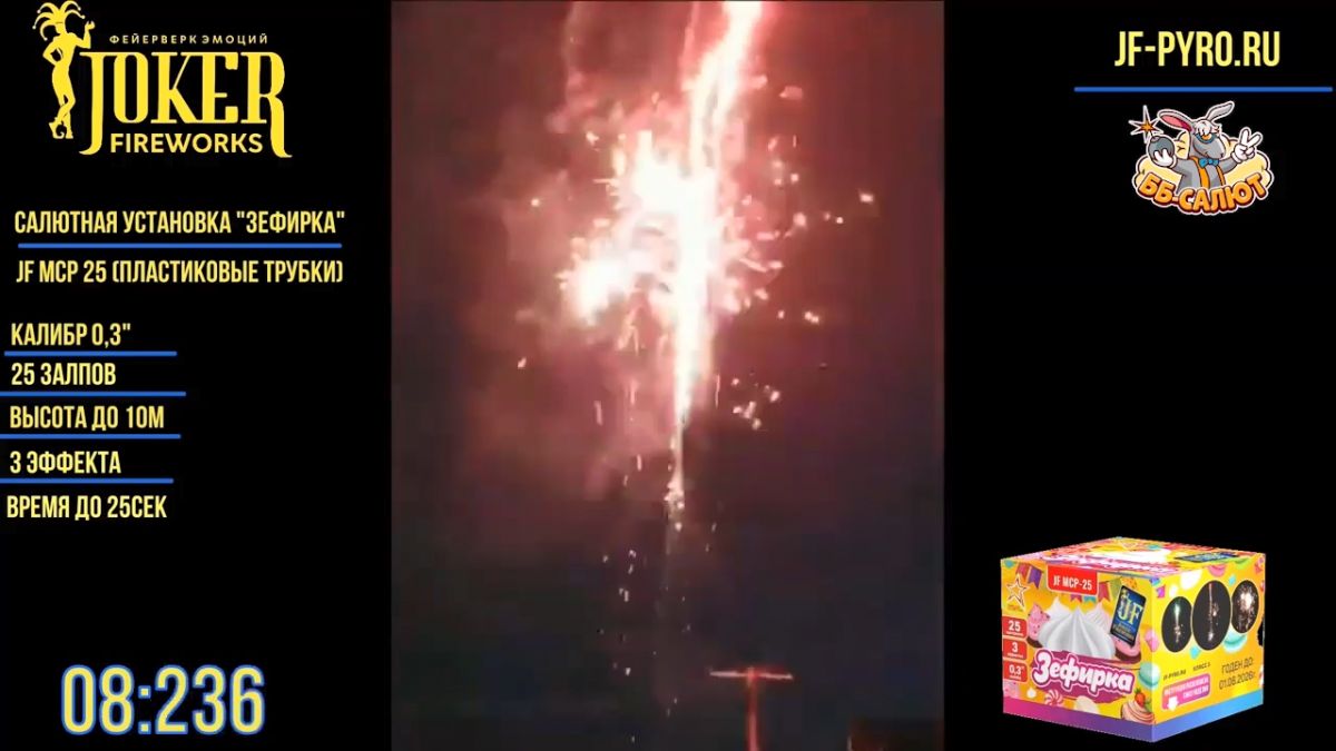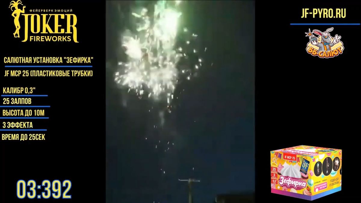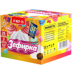 Фейерверк Зефирка выпускает 25 залпов за 25 секунд. Он имеет два цветовых эффекта - красные и зеленые звезды с пышной кометой. Ракеты вылетают на высоту до 10 метров и создают впечатление тающих в небе зефирок. Быстрый, стремительно вылетающий салют сопровождается громкими хлопками. Дополнительно потрясающий эффект создается за счет звука, напоминающего трещащую мину. Зрители с удовольствием будут наслаждаться динамичными спецэффектами и красотой ночного неба!