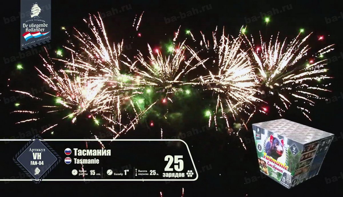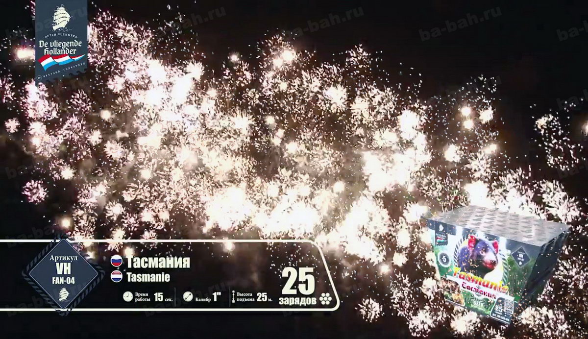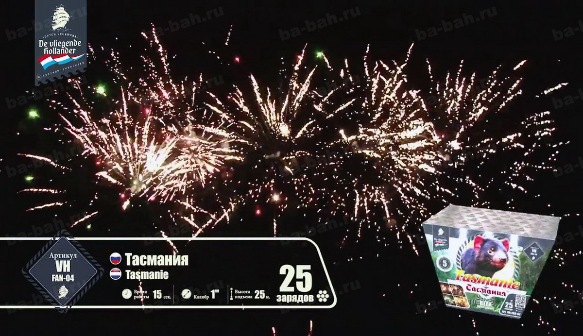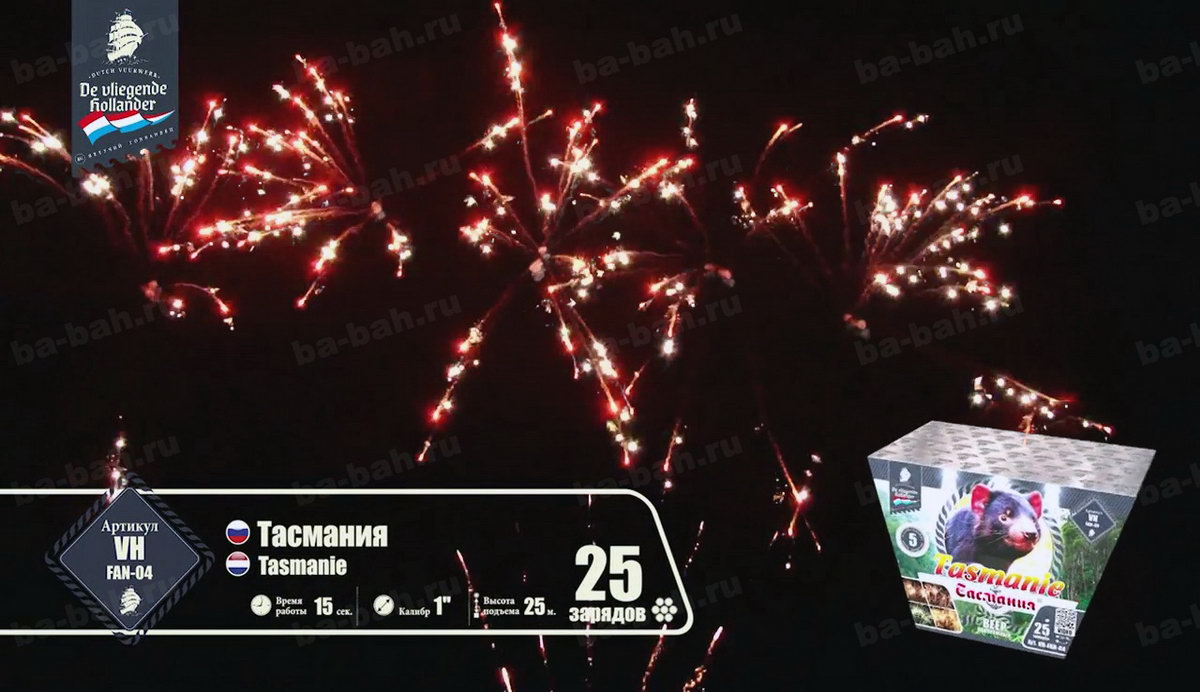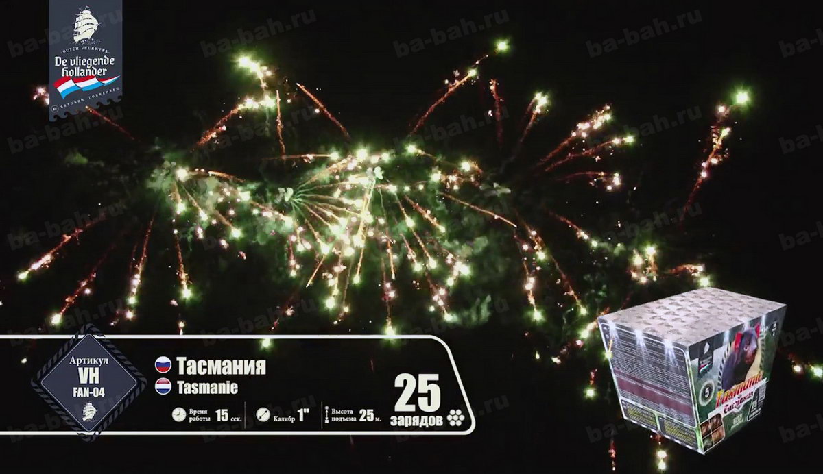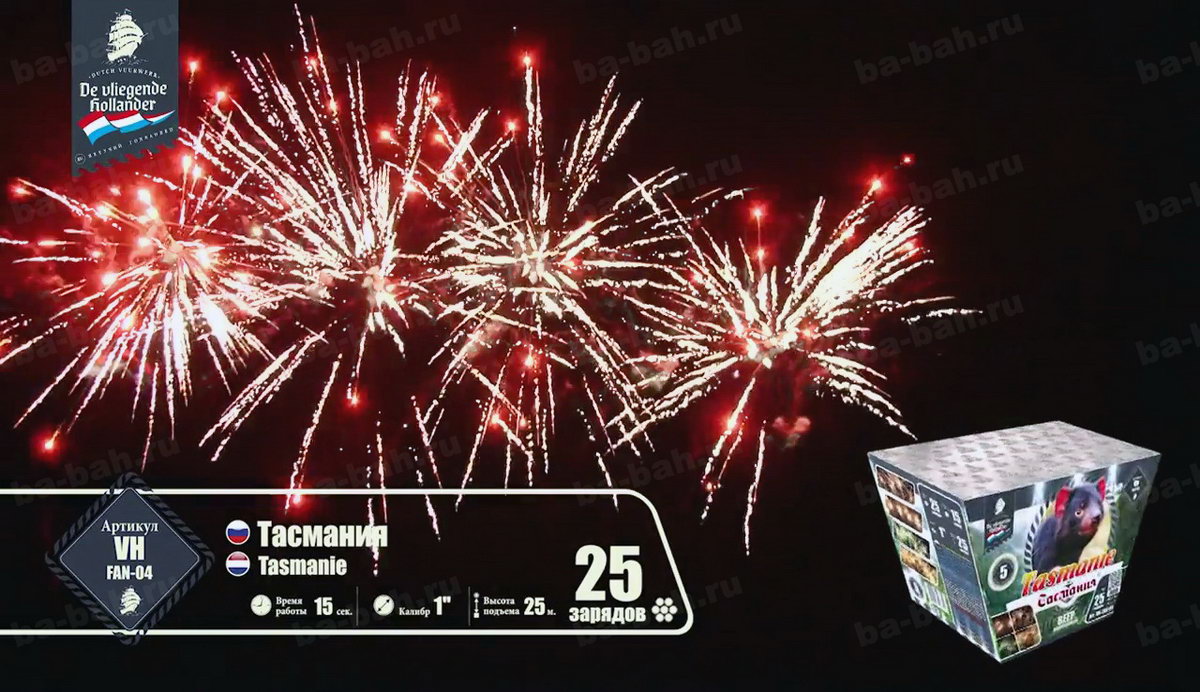 Вырывающиеся на свободу небесного пространства дикие залпы незабываемого фейерверка "Тасмания" обязательно пробудят Ваш интерес к этому острову. Если столь богатые, насыщенные эффекты, множество полыхающих огней, огромное изобилие трещащих искристых звездочек получили такое название, что тогда в действительности представляет собой австралийское побережье, названное в честь своего первооткрывателя - легендарного голладского мореплавателя? Какая интрига заключена в этом уникальном салюте? Насколько богат салют "Тасмания", настолько разнообразны и развлечения на острове. Шикарные песчаные пляжи, шум морских волн, на которых так мечтает прокатиться любой серфингист, многообразие цветов и растений, пестрящих изобилием на острове. Вот лучшее описание эффектов! Весь салют - это огромные волны, которые разбиваются о небесный океан множеством искристых, золотых от солнечного света, брызг, цветущие повсюду красочные огни и звезды, тонкие пиротехнические яркие пальмы.