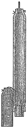 Набивка производится при помощи длинной металлической (лучше всего - алюминиевой) трубки, такой же гладкой изнутри, как и снаружи; калибр трубки соответствует калибру навойника, на котором заготовлена гильза, а длина должна быть вершка на 2-3 больше длины гильзы.