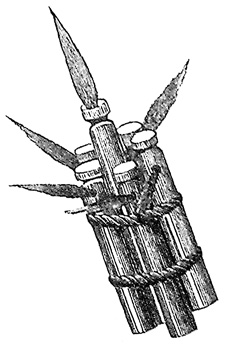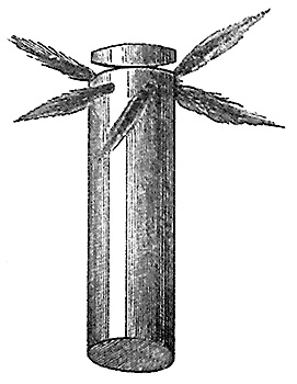 Из брандеров изготовляются планеты (Fixsternc). Маленькая планета состоит из крупного брандера, с обоих концов затянутого наглухо и забитого тампоном из крутого гипсового теста; под шейкой просверливают шесть запальных отверстий, расположенных вокруг конца брандера, по общей круговой линии; дно прикрепляется к стеллажу так, чтобы патрон висел горизонтально, головкой к зрителям. Все шесть запасов (Рис. 27) снабжают приводом п густо подмазывают. При спуске образует шестилучевую звезду.