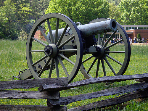 Подобное явление больше всего замечается у огнестрельных орудий: в момент своего образования пороховые газы имеют плотность, почти равную плотности заряда, т.е. занимают место, в 288 раз меньшее по природному объёму. Вследствие этого газы напирают на стены, на казенник (заднюю часть орудия) и на дно снаряда (ядра), но, встречая в стенах и казеннике сопротивление, достаточное, чтобы выдержать напор, газы эти со всей силой напирают на ядро или пулю, которые буквально выдуваются или выталкиваются («выбрасываются») в данном направлении.
