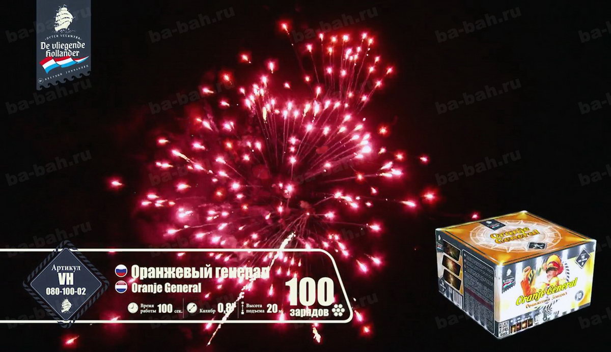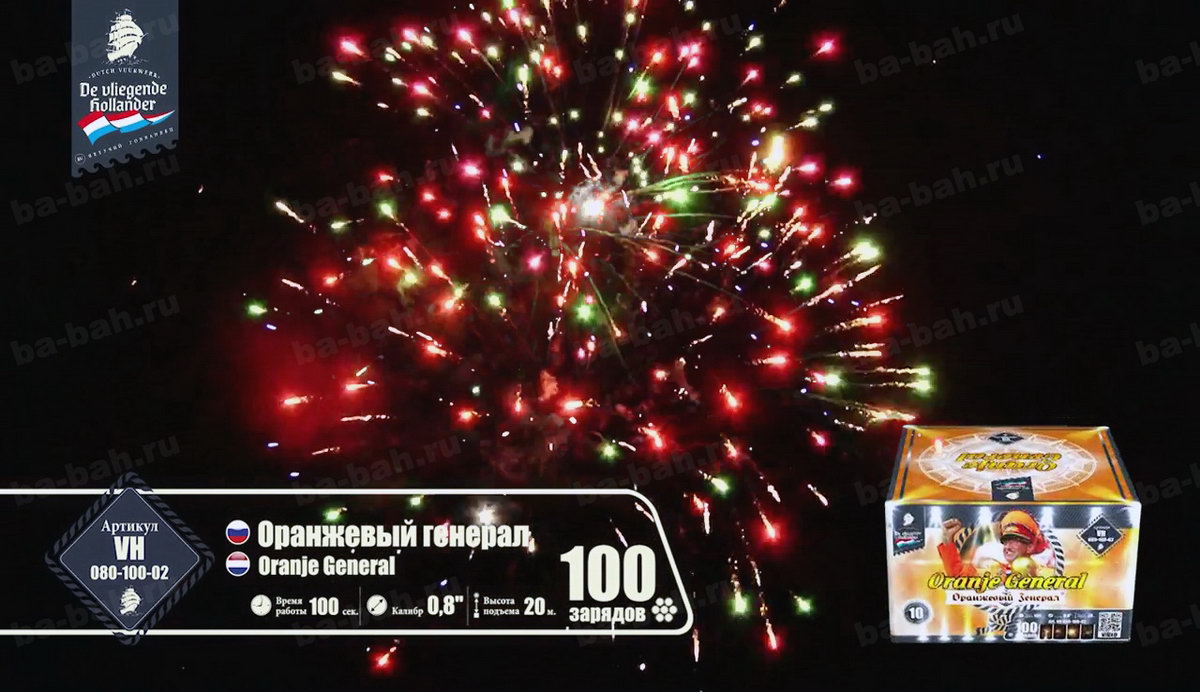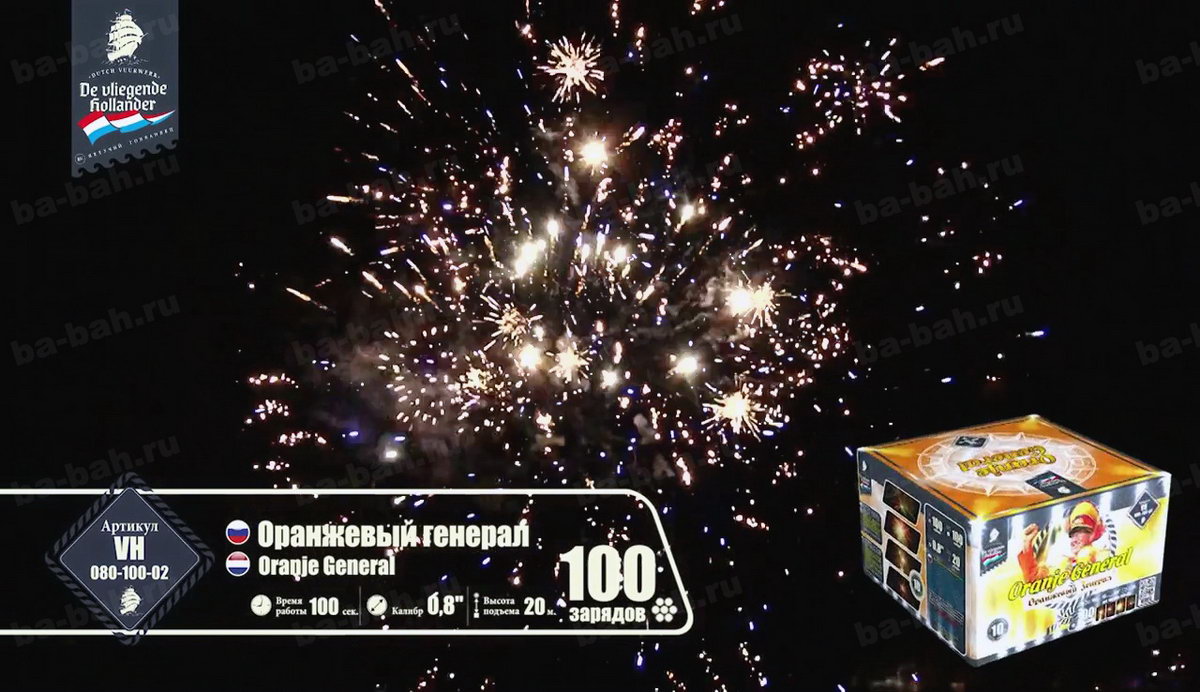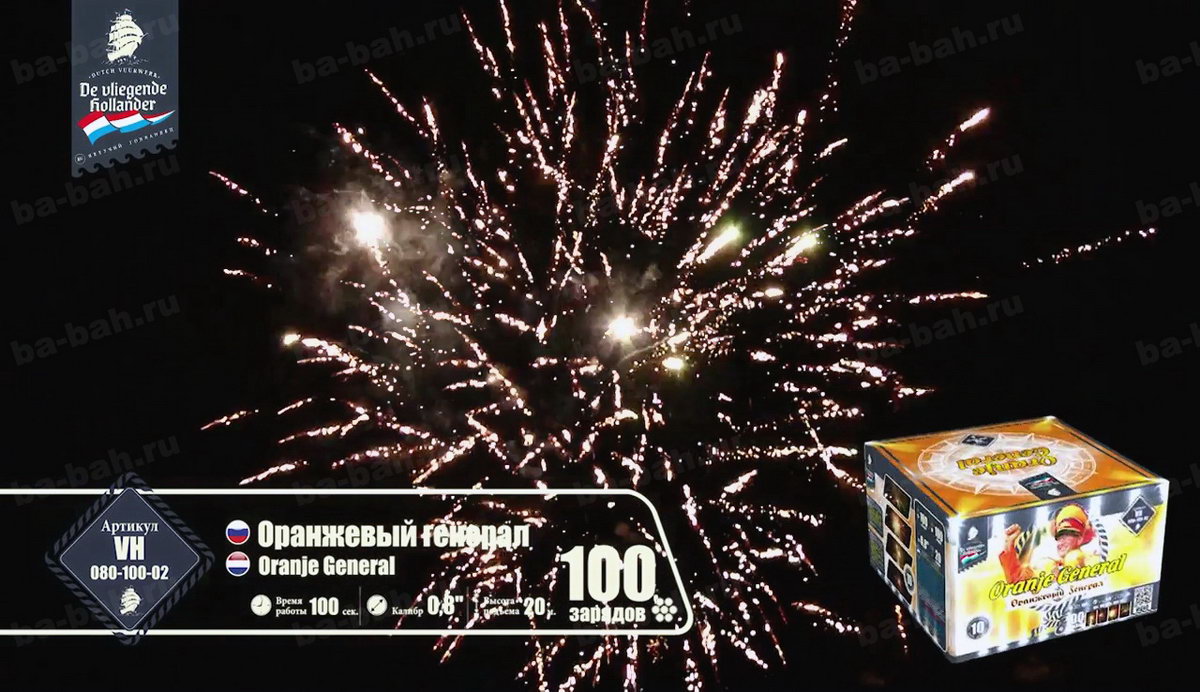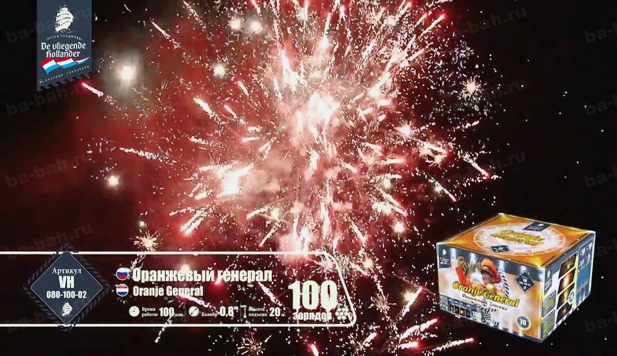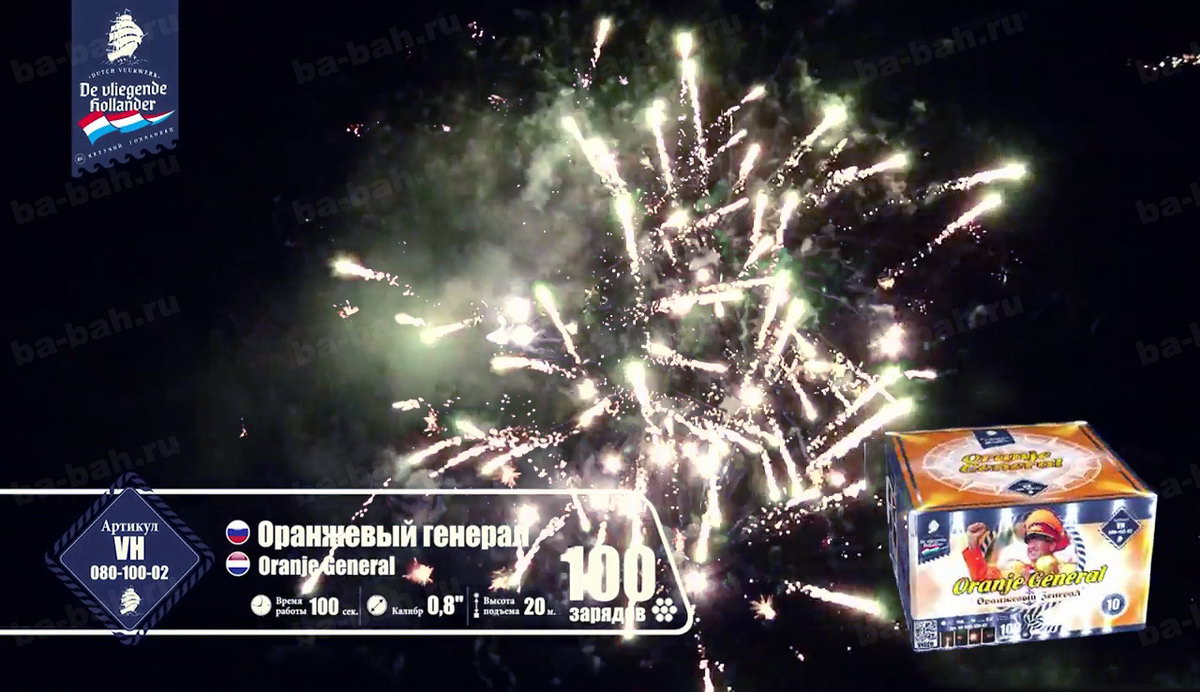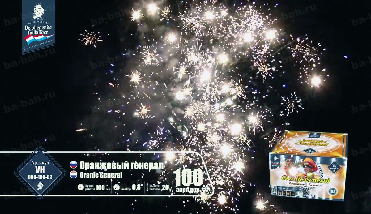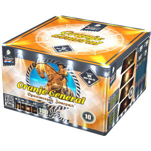 Оранжевый генерал - не просто название очередного зрелищного салюта. Это реальный человек, почетный болельщик сборной Голландии - Винфрид Витьес. Парадная генеральская форма и украшенная фуражка в тон костюму - померанцевого цвета. Привезенный из самой "страны тюльпанов" фейерверк - это хвала, уважение и низкий поклон всем фанатам и преданным болельщикам футбола. Спокойная игра на ночном небесном поле разноцветных огней против золотых разлетающихся звезд чередуется с особо опасными моментами и быстро забитым мячом - свистящей змейкой! Она летит настолько быстро и четко, что, кажется, футбольный мяч несется прямо в ворота и попадает точно в цель! Грандиозный финал - рев трибун, шум победы и радость болельщиков и команды, выраженная одновременными выстрелами множества разноцветных комет с яркими шлейфами, искрами и разрывающимися звёздами! Так приятно ощущать себя частью большого футбола и чувствовать себя чемпионом!