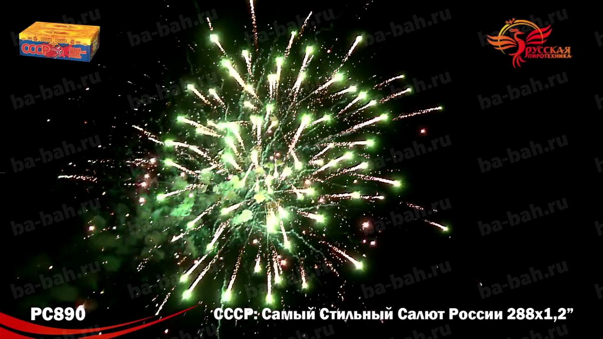 Фейерверк "СССР (Самый Стильный Салют России)" дарит трудящимся массам целых 25 потрясающих эффектов. Шипящие огненные, золотые, серебряные, белоснежные, искристые форсы идут вперемешку с гроздьями ярких огней: лиловых, зеленых, красных, фиолетовых, зеленых, небесно-голубых, оранжевых, белых, малиновых. Огромные облака из мерцающей золотой крошки делают салют еще более роскошным, а разнообразие и динамику вносят маленькие серебряные "рыбки" и пронзительно свистящие "змейки".