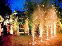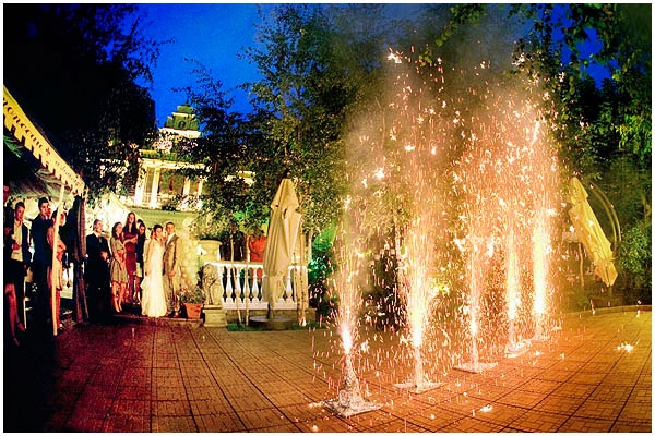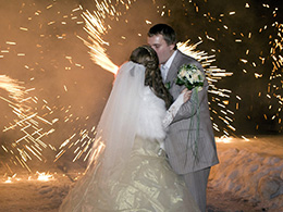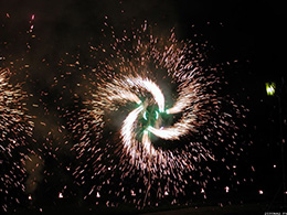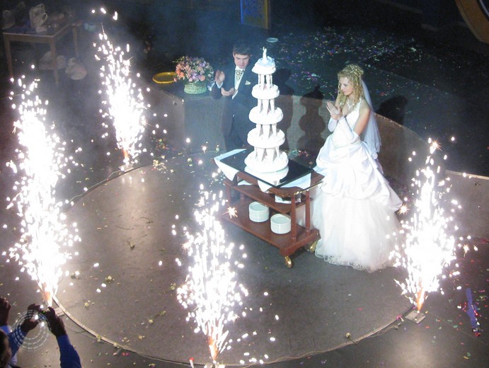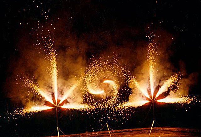 Использование огненных колес и вертушек разнообразит любую наземную композицию, как правило, их используют совместно с огненными надписями и фигурами. Вертушки вносят элемент динамичности: после того, как буквы загорелись, и отзвучали восторженные возгласы, горение продолжается достаточно продолжительное время, и гости могут начать скучать. В этот момент очень уместно будет запустить пару искрящихся, бешено вращающихся огненных колес, чтобы вновь поднять градус всеобщего восторга. Многие используют вертушки и во время свадебного танца - вы можете посмотреть пример этого, однако с нашей точки зрения, колеса слишком сильно отвлекают внимание от молодых, роль фона лучше выполнит огненный водопад.