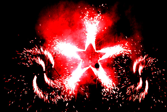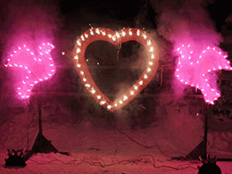 Самая популярная и востребованная разновидность наземных пиротехнических композиций. Огненные фигуры - это не просто красивое, эффектное шоу: в каждой композиции содержится конкретная информация. Классические варианты: название компании, логотип, имена жениха и невесты, огненные сердца, голуби и прочая свадебная аттрибутика. Огненные фигуры выполняются из так называемых "контурных свечей", небольших горящих фонтанчиков, которые для зрителей выглядят, как пылающие точки. Контурные свечи внешне очень похожи на фонтаны для торта, но эти изделия не являются взаимозаменяемыми. Контурная свеча дает меньший по размеру и менее искристый форс, который при этом является пожароопасным, т.е. в помещении их использовать нельзя. Для создания огненных букв и фигур используются контурные свечи различного цвета и времени горения: серебряные, золотые, белые, красные, зеленые, темно-зеленые, желтые, синие, голубые, фиолетовые. Имеются также свечи, которые в процессе горения меняют цвет, к примеру, с красного на синий или желтый. Такая характеристика свечи, как количество искр, также может создать интересный эффект. Например, великолепно смотрится серебряная свеча с большим количеством искр для создания контура свадебных голубков: разлетающиеся искры выглядят похожими на пушистые перышки (см. видео). Для пылающих алых сердечек, а также сложных логотипов, предпочитают использовать менее искристые контурные свечи, чтобы форма объекта оставалась понятной на большом расстоянии.
