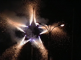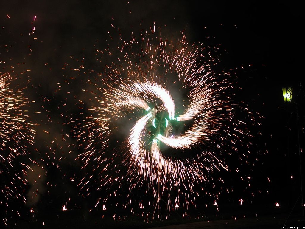 Профессиональные вертушки могут представлять собой очень сложные конструкции, эффект от которых превосходит все ожидания. Крутящиеся веера, сияющие двойные и тройные солнца, концентрические огненные круги, "мальтийский орден"... Вертушки совершенно не обязательно вращаются в вертикальной плоскости, есть немало других вариантов: каскады, спирали, "пчелиный рой"... Потрясающее впечатление производит трехметровая горизонтальная вертушка, сделаная на основе огнепада. Множество самых разнообразных динамических фигур описано в нашей Энциклопедии пиротехники, в статье "Декоративные фигуры и группы". Не будем повторять ее содержимое, скажем лишь, что сложность и красота динамической фигуры ограничена лишь мастерством и фантазией мастера-пиротехника... Некоторые наиболее популярные варианты огненных колес и вертушек вы можете посмотреть в нашей подборке видеороликов.