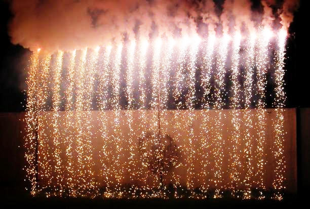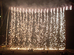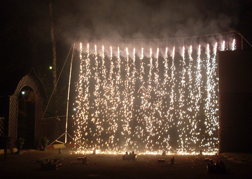 Огнепад создает потрясающий по красоте эффект, который стоит достаточно недорого. Это настоящий огненный водопад - сплошная стена из сверкающих искр, которая осыпается золотистым дождем с высоты нескольких метров. Технически огнепад представляет собой вариацию все тех же пиротехнических фонтанов, только закрепленных "вверх тормашками". Разумеется, обычные концертные фонтаны в таком положении работать не будут, поэтому используются специальные изделия, закрепленные на специальном огнеупорном тросе. Трос с фонтанами закрепляют достаточно высоко (от 4 до 6 метров), чтобы создать более эффектную и объемную стену искр. Ближе к земле отдельные искристые потоки сливаются, образуя сплошную реку огня!