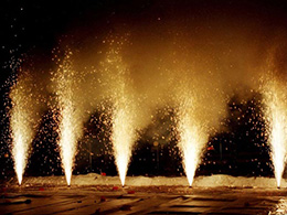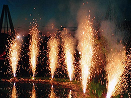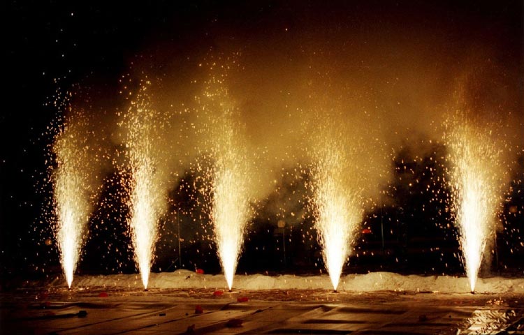 Как правило, используются те же изделия, что и в сценической пиротехнике. Фонтаны создают поток ("форс") одноцветных ярких искр высотой от полутора до 5-6 метров, с временем горения от 20 секунд до 1 минуты. Безусловно, для использования на открытом воздухе Вы можете купить и обычные бытовые пиротехнические фонтаны. В ассортименте интернет-магазин ББ-Салют всегда есть в наличии такие изделия, как "Золотой вулкан", "Серебряный вулкан", "Золото Сибири", "Волжское серебро", которые создают аналогичный по внешнему виду одноцветный искристый фонтан, при существенно меньшей цене. Такие фонтаны подойдут, если вам необходимо запустить одно изделие. Если же ваша задача - синхронное срабатывание цепочки из нескольких фонтанов, потребуется профессиональная пиротехника. Профессиональные сценические фонтаны монтируются на электрическую цепь и запускаются строго одновременно командой с пульта. В отличии от бытовых фонтанов, такие изделия не создают горячих искр, дают очень мало дыма, имеют более равномерную высоту искристого потока и продолжительность работы - у бытовых фонтанов эти характеристики могут немножко "гулять", т.к. они не расчитаны на одновременное использование нескольких изделий.