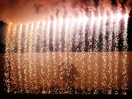 Пиротехнические вспышки также ведут свое происхождение от концертных, или сценических, фонтанов. После инициации вспышка производит однократный выброс множества ярких искр. Искры могут быть как классическими серебряными/золотыми, так и разноцветными: зелеными, желтыми, красными, фиолетовыми, синими. При использовании вспышек стоит иметь в виду, что их эффект не моментальный: общая длительность, от запуска до полного опадания потока искр - порядка пяти секунд. Вспышки лучше всего использовать группами, для создания интересных динамических эффектов: разбегающихся дорожек, расходящихся концентрических кругов, в качестве акцента в начале или конце пиротехнического шоу. Представьте, например, выездную свадебную церемонию: жених с невестой вместе идут по дорожке, и каждые несколько метров, сбоку от места прохождения молодых вспыхивает небольшой фонтанчик из искр! Выглядит это весьма впечатляюще.