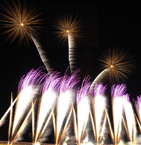 Главной особенностью парковых фейерверков является то, что их эффект распространяется на все пространство от земли до верхней точки траектории полета (те самые 35-50 метров). Фактически, они срабатывают еще на земле, сразу же после пуска, создавая красочные веера, "стены огня", выпуская звезды с длинными и пушистыми хвостами. У высотных салютов совершенно другая концепция: пока заряд летит на соответствующую своему калибру высоту, он представляет собой малозаметную, небольшого размера звезду. И лишь достигнув 100, 150 или 200 метров взрывается ослепительной сферой, хризантемой, пальмой или плакучей ивой. После чего гаснет или пропадает, опять-таки оставаясь при этом на высоте срабатывания.