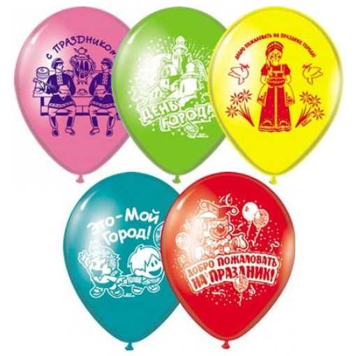 Воздушные шарики из качественного натурального латекса, производитель - BelBal (Бельгия) или Gemar (Италия). Шарики ассорти различных цветов с рисунками и надписями на тему "День Города". Шарики обработаны составом Hi-Float для максимальной продолжительности полета, и наполнены гелием.