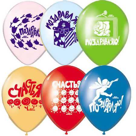 Воздушные шарики из качественного натурального латекса, производитель - BelBal (Бельгия) или Gemar (Италия). Шарики ассорти различных цветов с рисунками и надписями на тему "Поздравляю!" (нейтральное поздравление, изображения цветов, улыбок и проч., подходит к любому празднику). Шарики обработаны составом Hi-Float для максимальной продолжительности полета, и наполнены гелием.