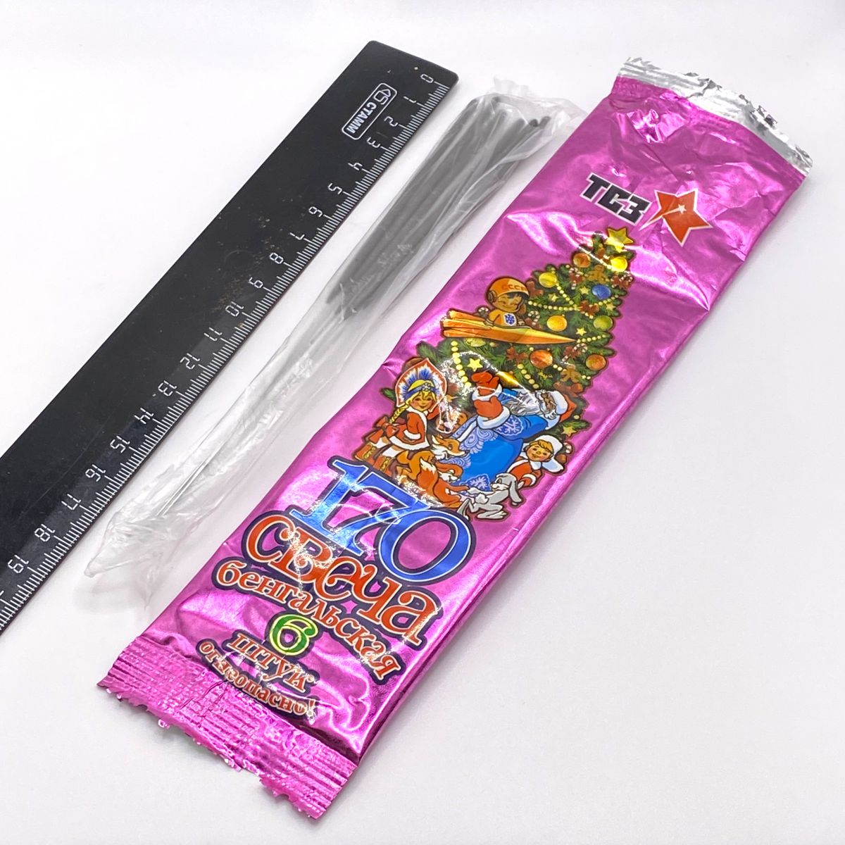 Классическая новогодняя бенгальская свеча российского производства, от Троицкого снаряжательного завода (г.Сергиев Посад Московской области). С шипением горит, разбрасывая золотые искры. Продолжительность работы одной свечи - около минуты. В каждой упаковке - 6 свечей. Свечи сложены в целофанновый пакетик, который находится внутри фольгированной упаковки, такая двойная упаковка необходима для защиты бенгальских свечей от влажности. Обратите внимание, что возможен различный дизайн самой упаковки - картинка постоянно варьируется производителем.