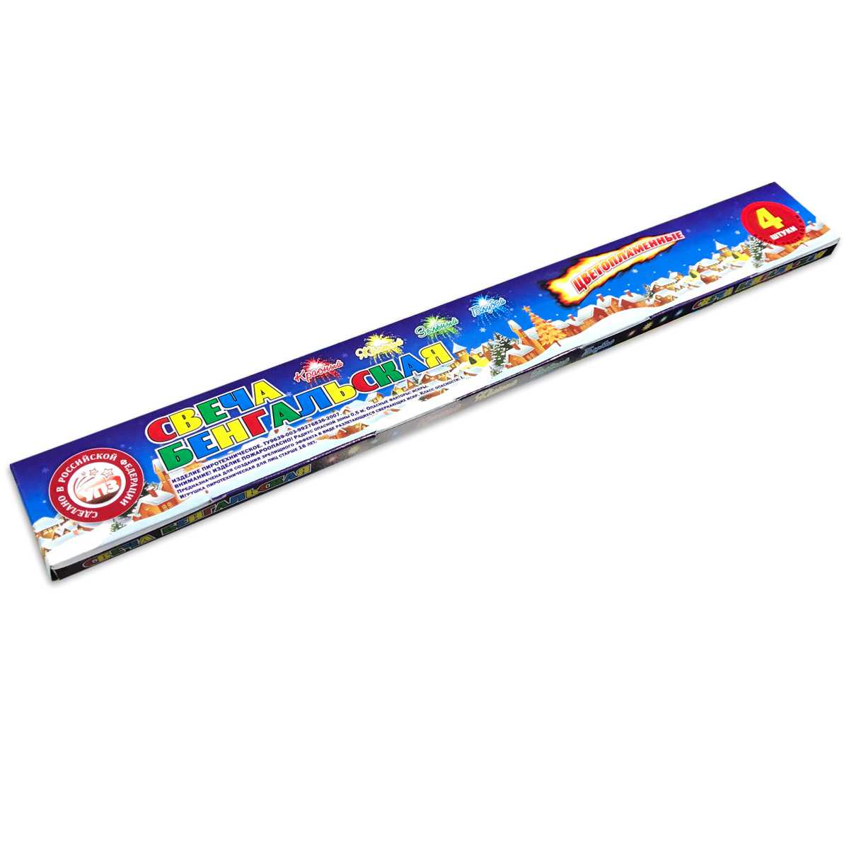 Классика жанра - цветные бенгальские свечи от Уральского Пиротехнического Завода! Толстые и внушительные, эти бенгальские огни горят ослепительно ярко, цвета - очень насыщенные: красный, желтый, зеленый, голубой. В упаковке - 4 свечи, по одной каждого цвета. Бенгальские огни можно использовать только на открытом воздухе.