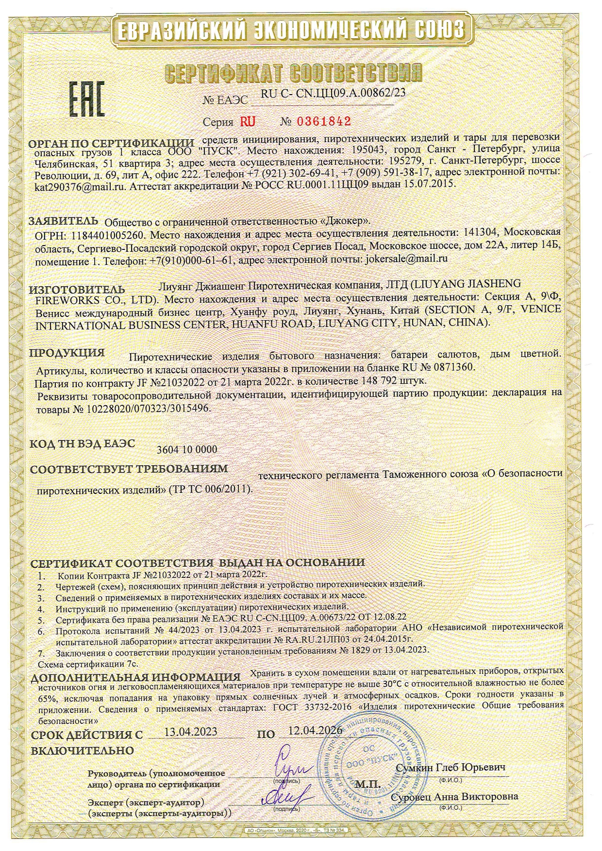 Магазин фейерверков ББ-Салют предоставляет гарантию на весь ассортимент интернет-магазина и розничных магазинов ББ-Салют! Мы торгуем пиротехникой самых лучших, проверенных торговых марок. Все изделия сертифицированы для продажи на территории России и имеют актуальный срок годности.