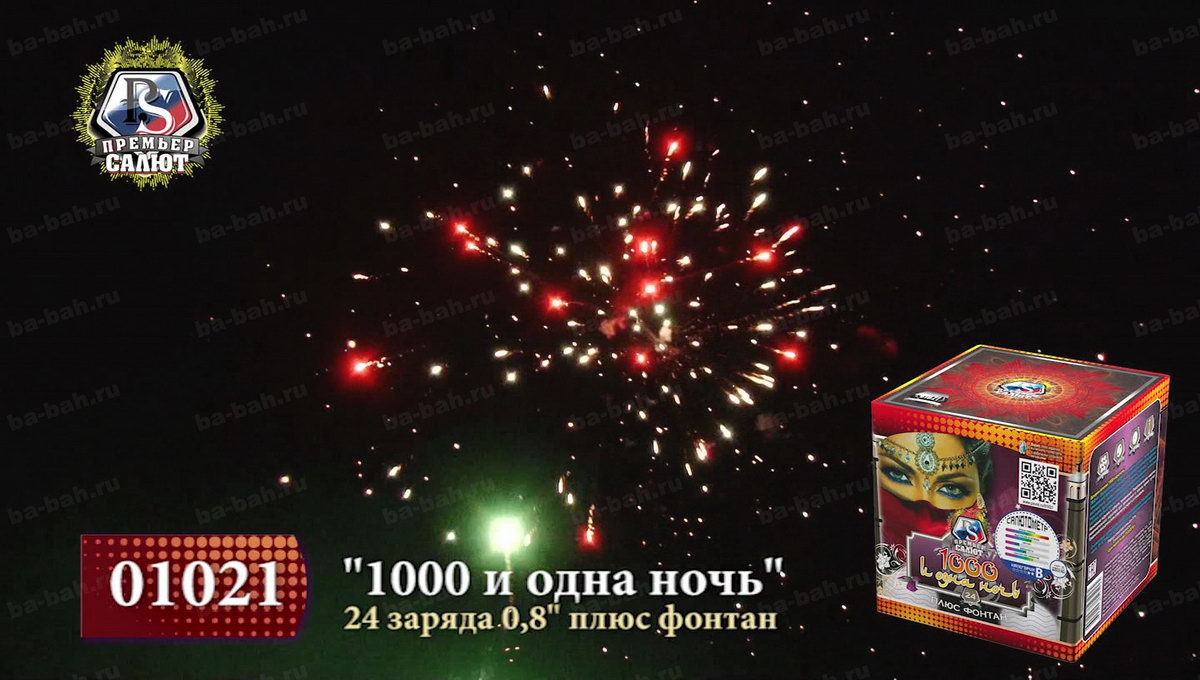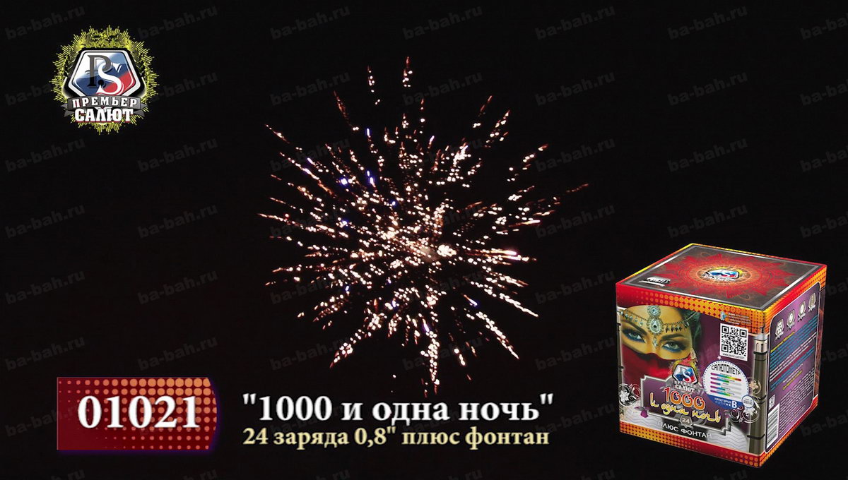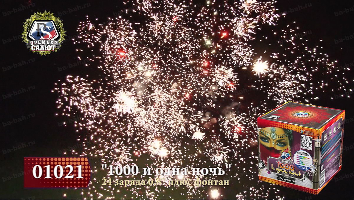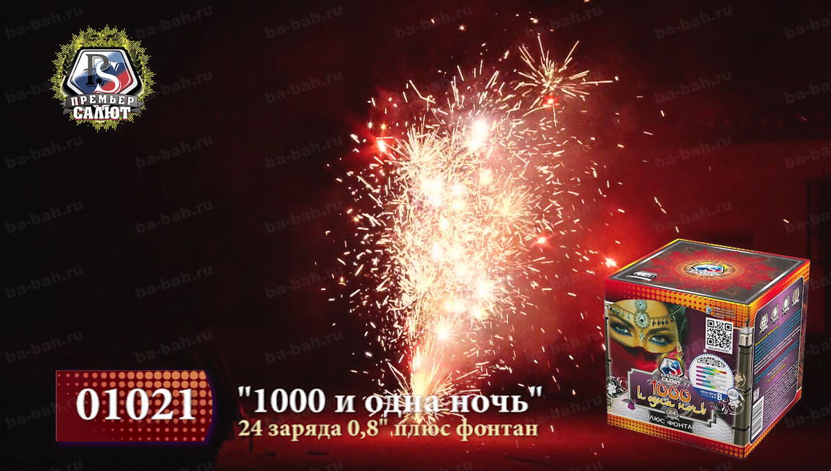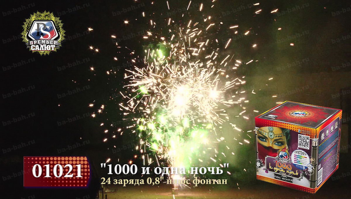 Загадочный восточный мир раскроется перед зрителями с фейерверком "Тысяча и одна ночь". Кажется, что чувственная, благородная и нежная Шахерезада сама рассказывает о чудесах и жизни соблазнительных наложниц, деяниях царя Шахрияра, распутной жизни и благородстве, нравственности и неверности. Как и в персидском сборнике захватывающих легенд, начинается повествование с тихого вступления фонтана, который плавно и бесшумно вытекает золотым потоком и нежными фиолетовыми огнями. Кажется, что именно так звучит тихий ровный голос загадочной рассказчицы. Постепенно сюжет разворачивается, и тишина нарушается холодными колючими искрами, громким треском, который переходит в красочный небесный рассказ из множества мерцания, изобилия искр и огней. Но Шахерезада не так глупа, чтобы закончить повествование. К финалу страсти утихают, но искристые перламутровые колючки и огоньки не дают забыть об этом салюте. Все ждут продолжения и следущей истории хитрой Шахерезады.