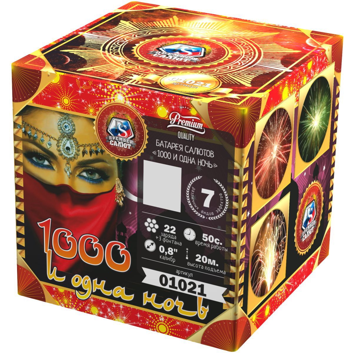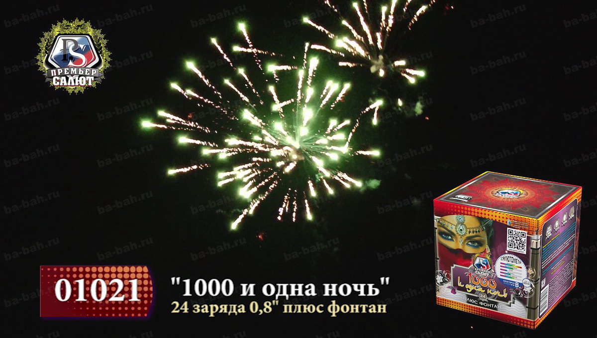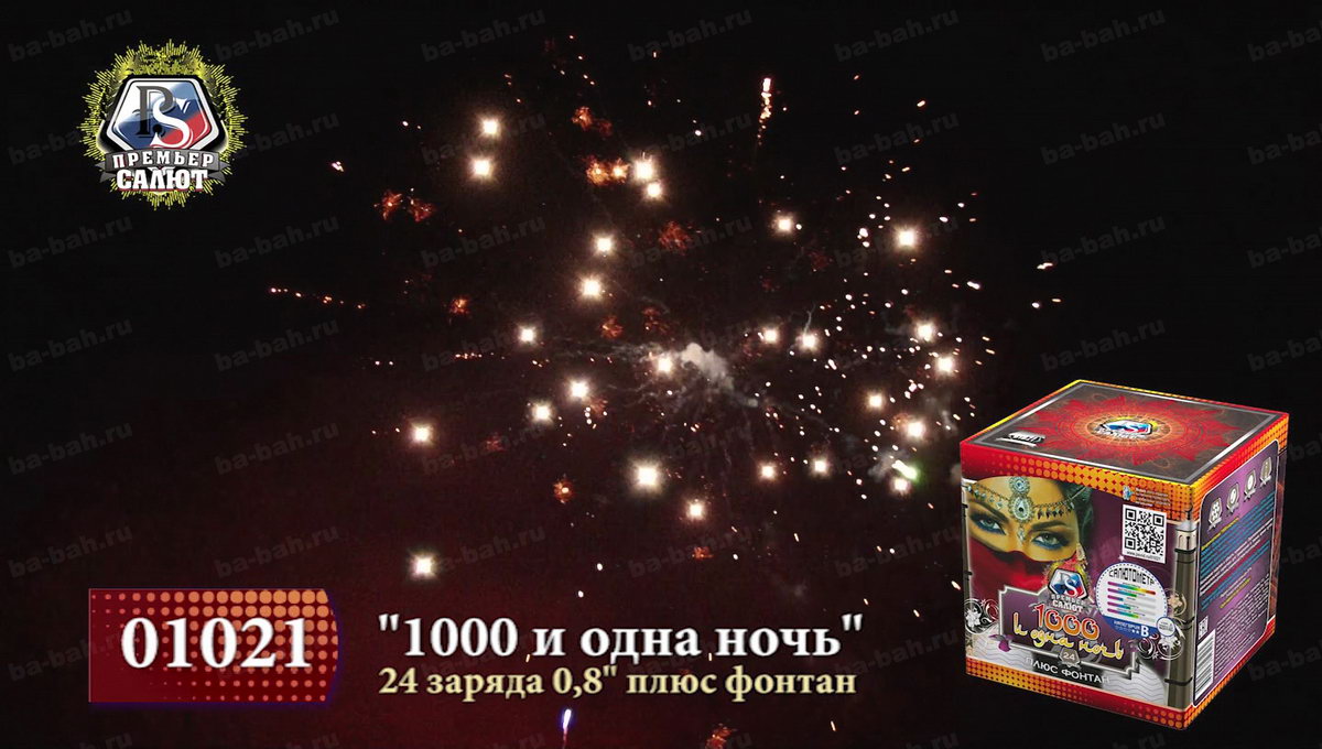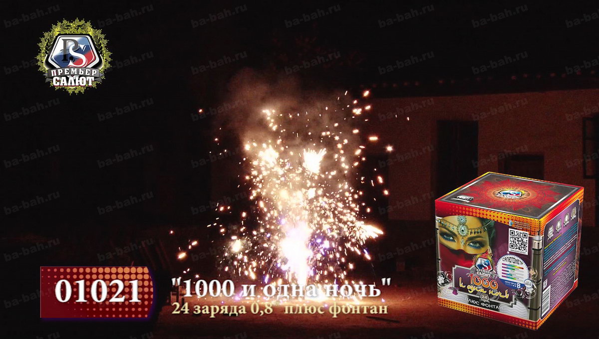 Загадочный восточный мир раскроется перед зрителями с фейерверком "Тысяча и одна ночь". Кажется, что чувственная, благородная и нежная Шахерезада сама рассказывает о чудесах и жизни соблазнительных наложниц, деяниях царя Шахрияра, распутной жизни и благородстве, нравственности и неверности. Как и в персидском сборнике захватывающих легенд, начинается повествование с тихого вступления фонтана, который плавно и бесшумно вытекает золотым потоком и нежными фиолетовыми огнями. Кажется, что именно так звучит тихий ровный голос загадочной рассказчицы. Постепенно сюжет разворачивается, и тишина нарушается холодными колючими искрами, громким треском, который переходит в красочный небесный рассказ из множества мерцания, изобилия искр и огней. Но Шахерезада не так глупа, чтобы закончить повествование. К финалу страсти утихают, но искристые перламутровые колючки и огоньки не дают забыть об этом салюте. Все ждут продолжения и следущей истории хитрой Шахерезады.
