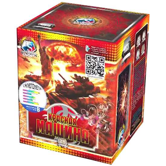 25-ти зарядный фейерверк с необычным названием "Красная машина" - это завораживающий огонь незабываемых эффектов. "Красная машина" - это воплощение страсти, это небольшой салют, созданный для истинных почитателей такого вида отдыха и развлечений. Не смотрите на коробку, а изучите содержание - оно лучше громких слов! В ярких малиновых, зеленых и синих огнях, переходящих плавно в нежное мерцание показывается трепетное чувство к зрителю. Маленькие золотые ниточки взрываются в трещащие небольшие облака, которые сменяют белоснежно-розовые сферы с мерцанием и разноцветные огни с нежным малиновым блеском. А в конце салют непременно подарит Вам звездное, мерцающее, алое от любви небо и множество золотых россыпей - как символ щедрости и изобилия преданности любимому зрителю. Восхитительное сочетание мерцания, вспышек и цветов. Полученный от фейерверка "Красная машина" восторг превосходит все возможные ожидания.