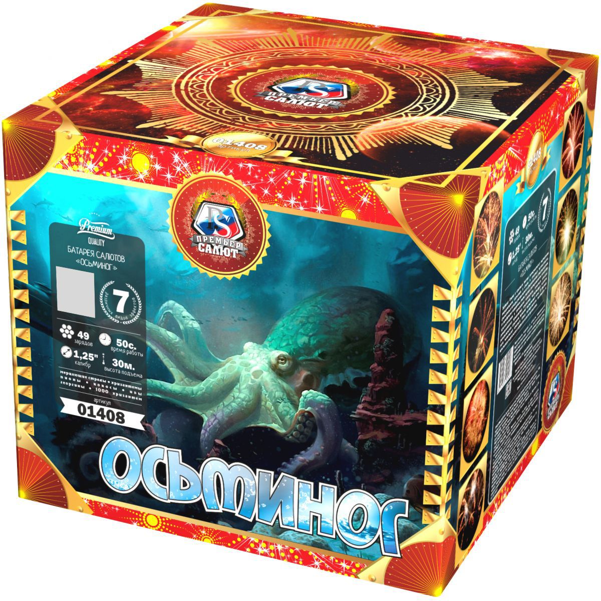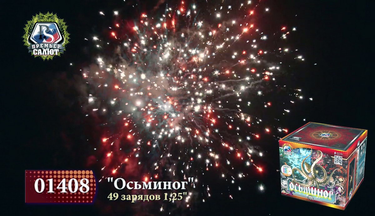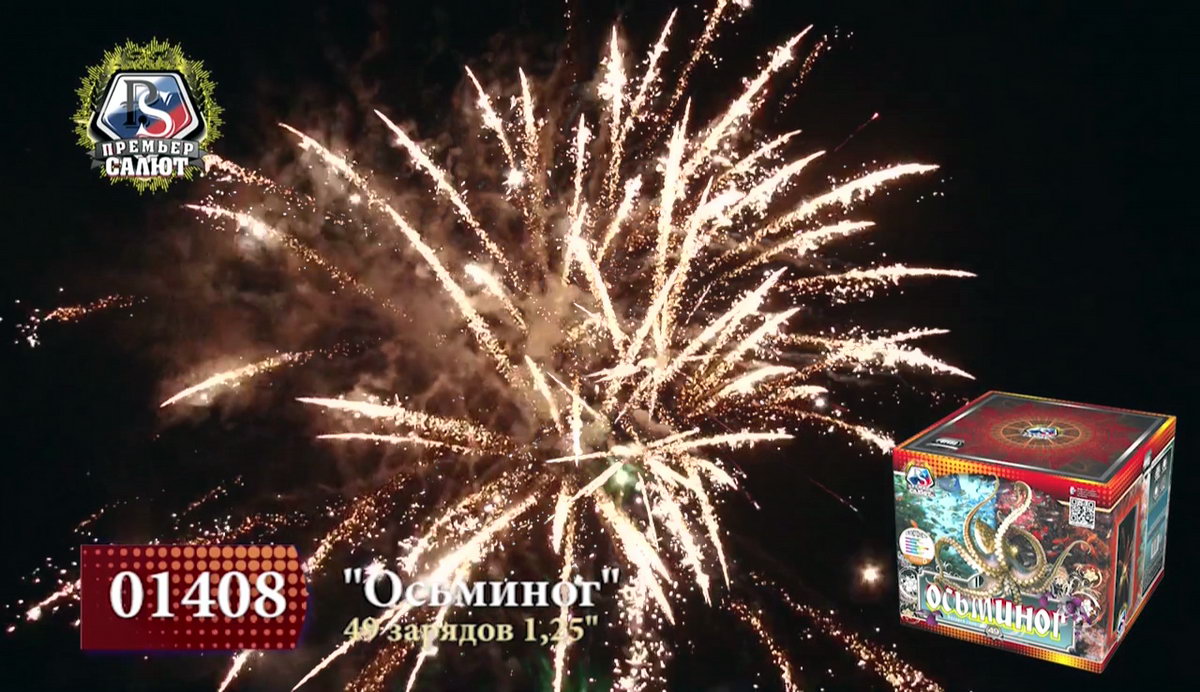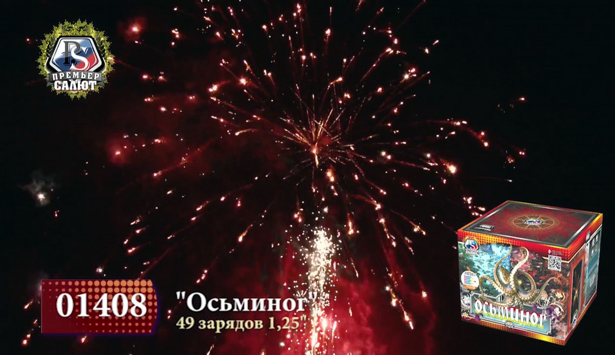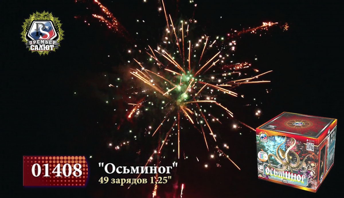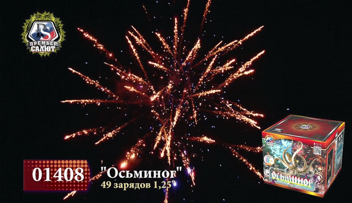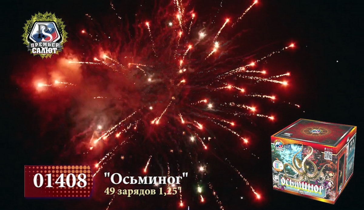 Настоящий царь морских глубин, огромный осьминог хитер: меняет цвет и форму, оценивая реакцию зрителей на его танец. Длинные щупальца из огненно-рыжих, тонких и мерцающих нитей с синими огнями, изумрудные звезды с трещащими тонкими языками пламени, ярко-алые и белые матовые сферы с мерцанием бьются, как сердце огромного спрута. Красные кометы с небольшими шлейфами уже готовы опутать Вас, утащив на самое дно. А вот и фирменный трюк - смена окраса! золотые хризантемы с треском и шумом трансформируются в искристые ниспадающие огненные стрелы, а затем - в пышное трещащее облако, переполненное искристыми ракушками и крупными зелеными бусинами. Наблюдая за красивейшим танцем осьминога, не теряйте бдительности, если не хотите попасться в его опасные щупальца!