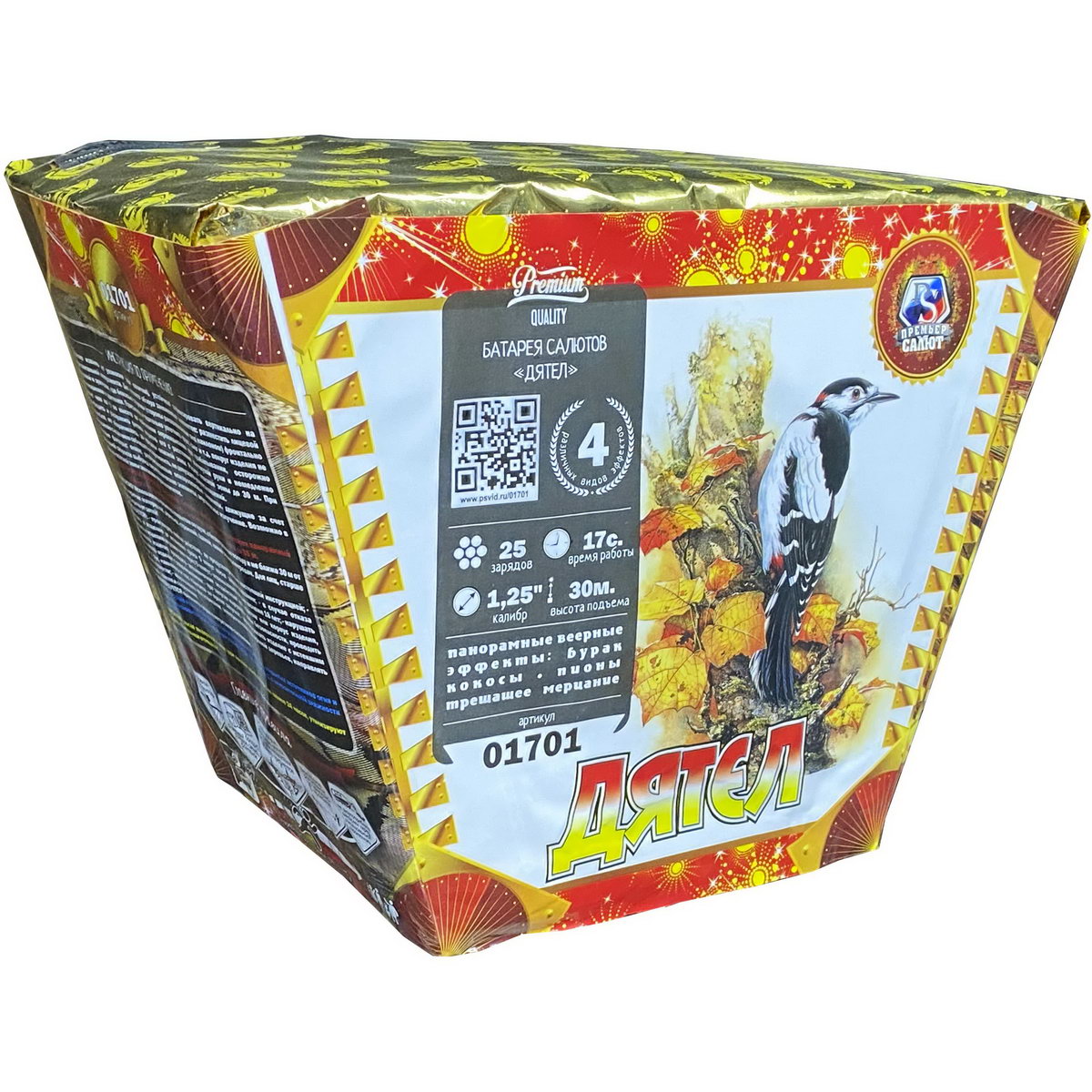 Эффектный веерный салют "Дятел" восхитит вас двухуровневым залпом: нижний уровень - изумрудные звезды, верхний - алые и синие звезды, золотые кокосы, мерцающие пионы красного и зеленого цвета, серебряное мерцание и треск. Для подобного эффекта цена - очень скромная.