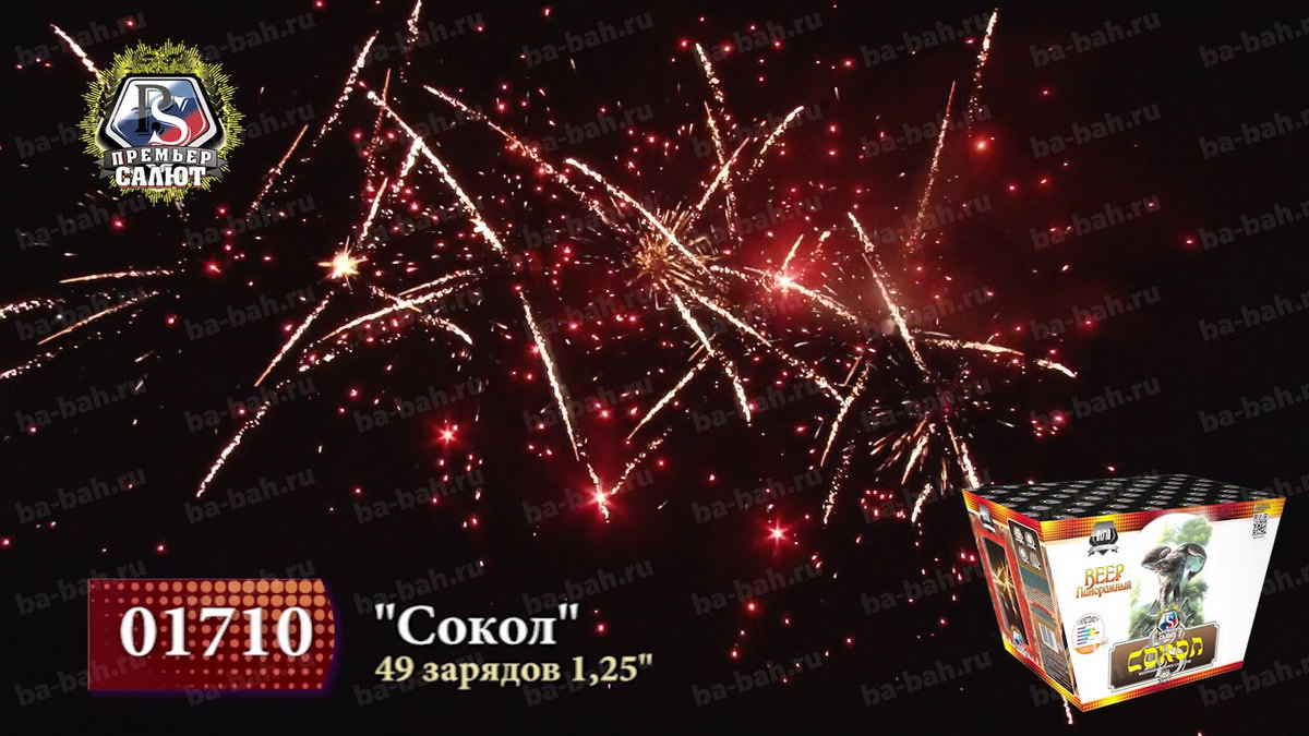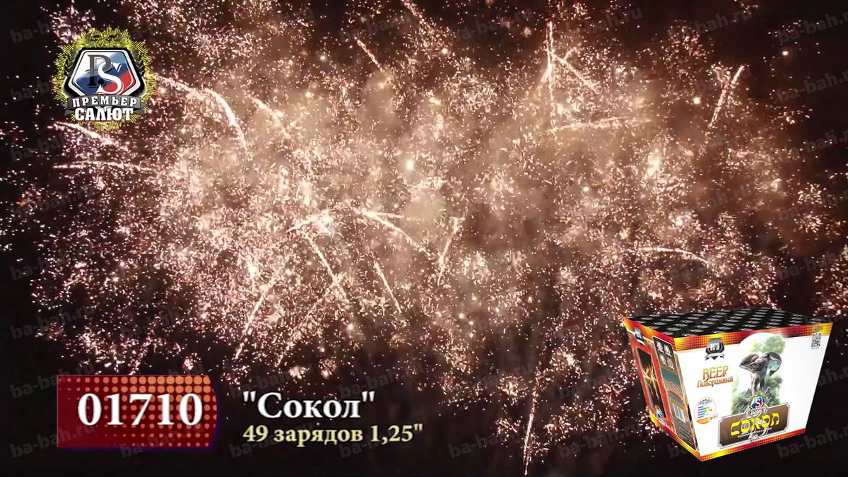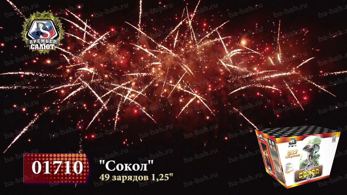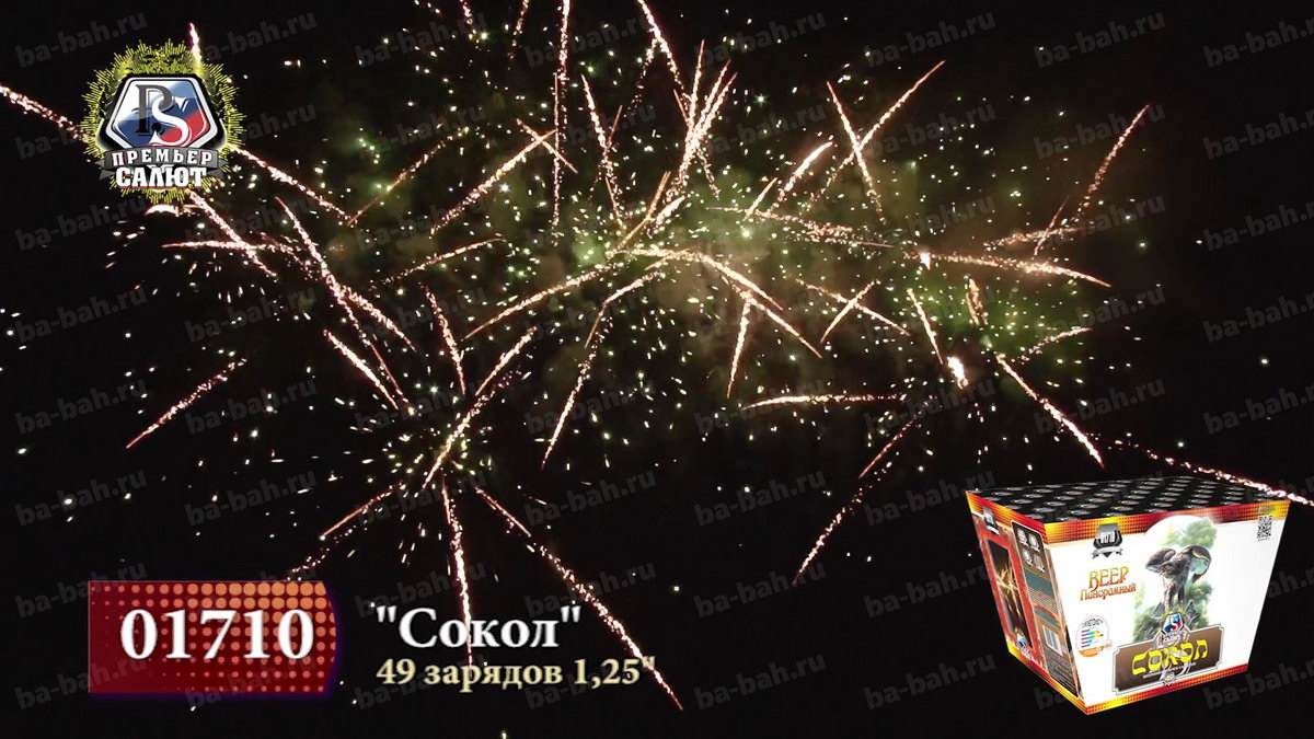 Панорамный фейерверк "Сокол" - это самое впечатляющее зрелище, которое можно купить за цену этого салюта. 49 залпов фейерверка "Сокол" раскрываются веерами из золотых "кокосовых пальм" и мерцающих пионов зеленого, желтого и серебряного цвета. Финальный залп - серебряные кометы раскрываются коронами, которые с громким треском переходят в эффект "тысячи хризантем". Да, безусловно есть салюты с большим количеством залпов, большей продолжительностью или калибром, но мало что сравнится с "Соколом" по ошеломительному эффекту, производимому на зрителей!