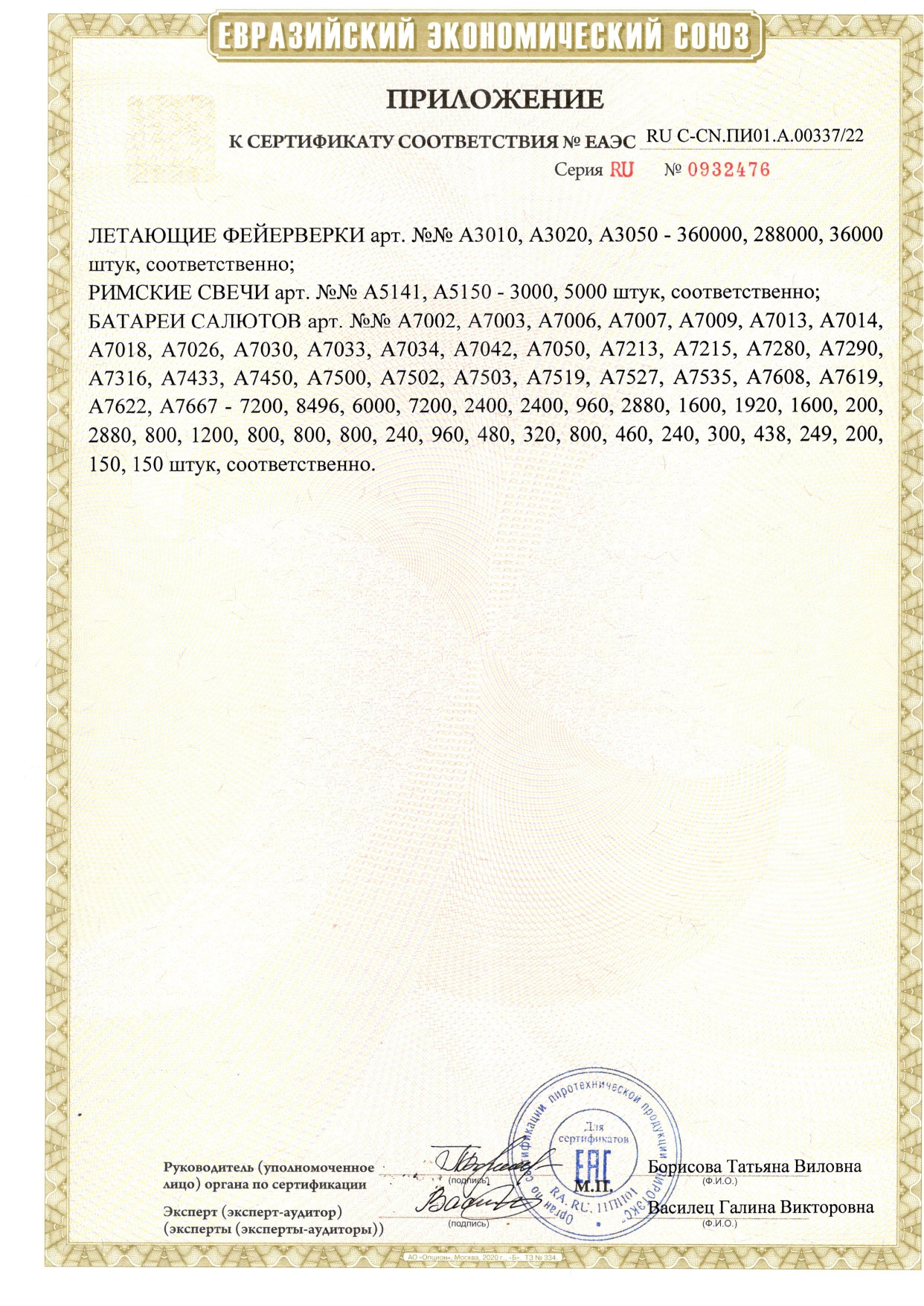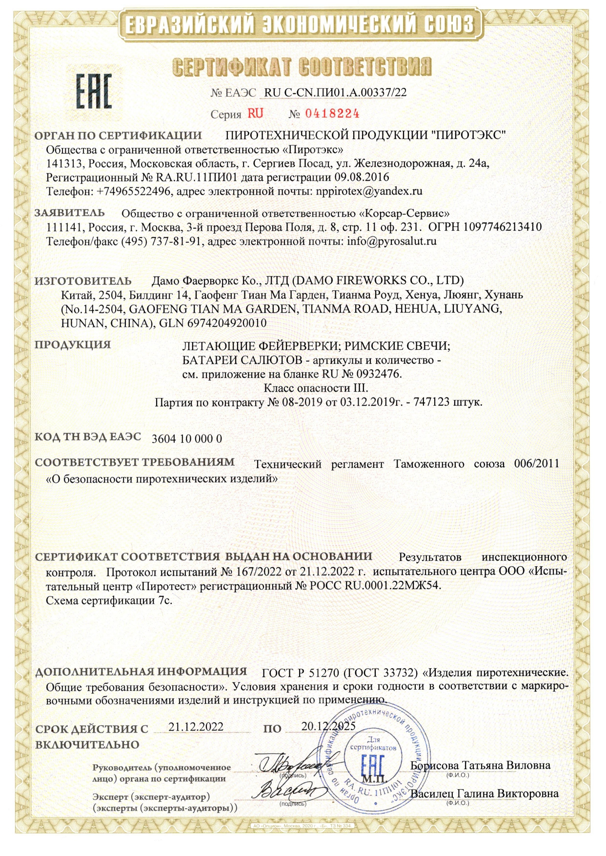 Магазин фейерверков ББ-Салют предоставляет гарантию на весь ассортимент интернет-магазина и розничных магазинов ББ-Салют! Мы торгуем пиротехникой самых лучших, проверенных торговых марок. Все изделия сертифицированы для продажи на территории России и имеют актуальный срок годности.