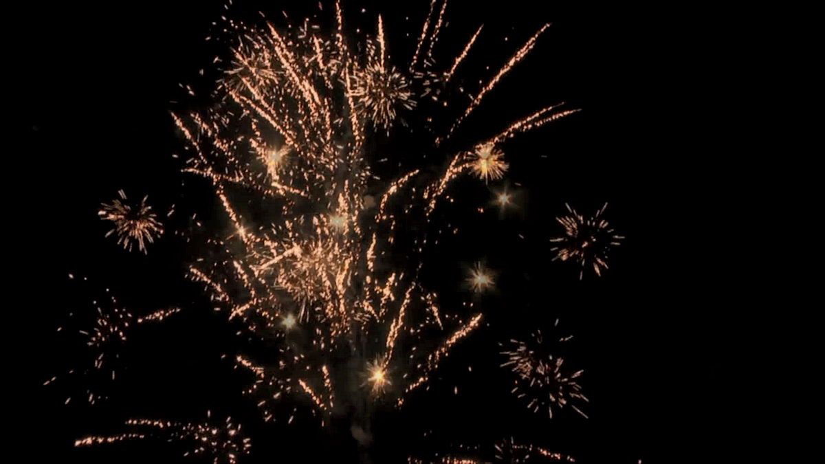 Взлетающие в темное небо зеленые кометы вспыхивают синими, пурпурными и красными звездами, которые превращаются в тысячи хризантем, мерцающих и издающих треск. Следом с треском взрываются красные и зеленые ракеты, оставляя после себя искрящиеся огни. И в завершении звучит залп из нескольких комет, которые со свистом распадаются на золотые короны и трещащие, мерцающие хризантемы.