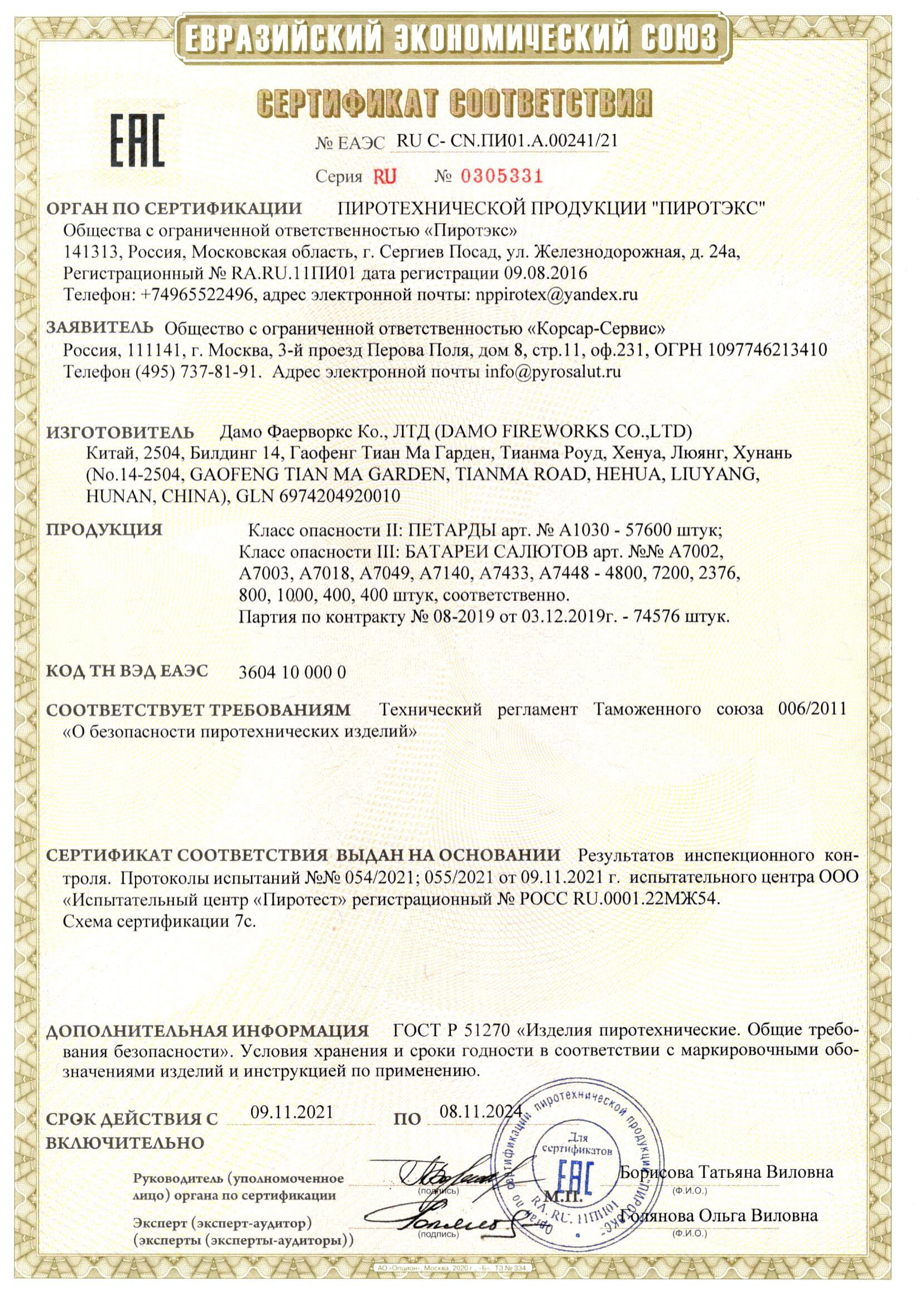 Магазин фейерверков ББ-Салют предоставляет гарантию на весь ассортимент интернет-магазина и розничных магазинов ББ-Салют! Мы торгуем пиротехникой самых лучших, проверенных торговых марок. Все изделия сертифицированы для продажи на территории России и имеют актуальный срок годности.