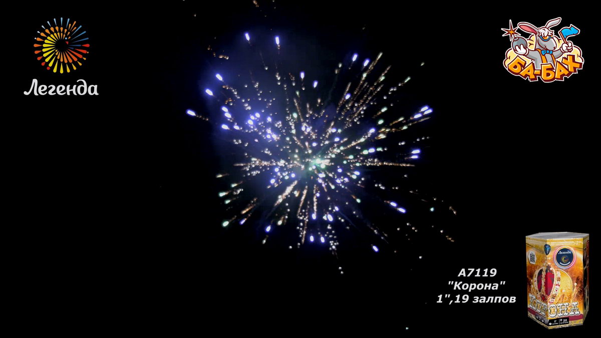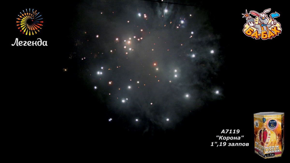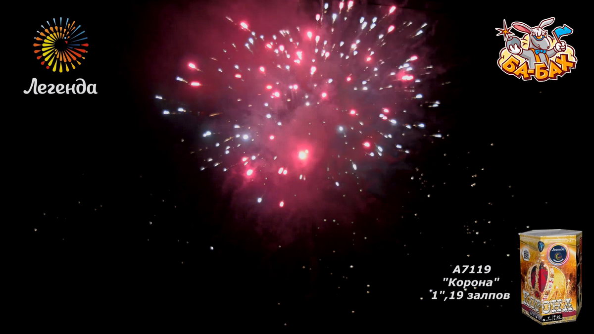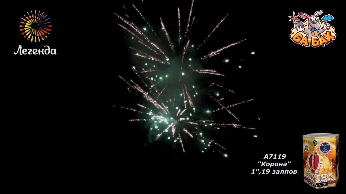 Представляем фейерверк "Корона" ! Красные звезды раскрываются красными, словно рубины, пионами, окруженными блеском множества серебристых огней. Большие золотые кокосы расцветают изумрудными пионами и голубыми топазами-георгинами, превращающимися в тысячи золотистых сияющих хризантем. И завершает "коронное" представление одновременный залп красных звезд, с треском разбрызгивающих капли золотого сияния.