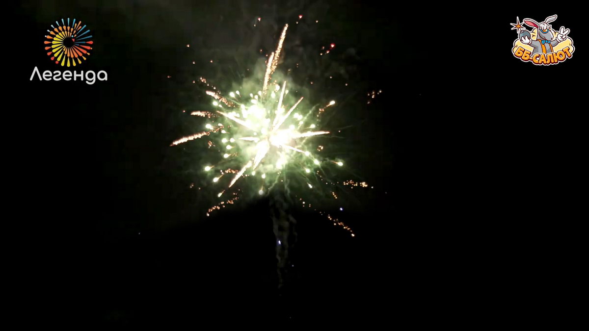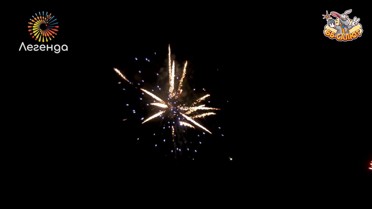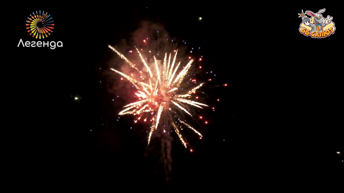 1. Разноцветные звезды раскрываются золотыми кокосами в синих, зеленых и красных пионах. 2. Финал: Залп нескольких зарядов.