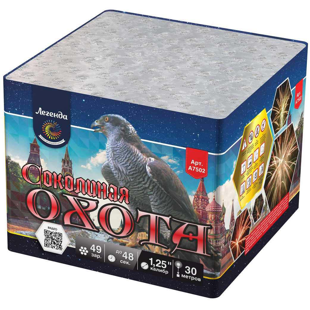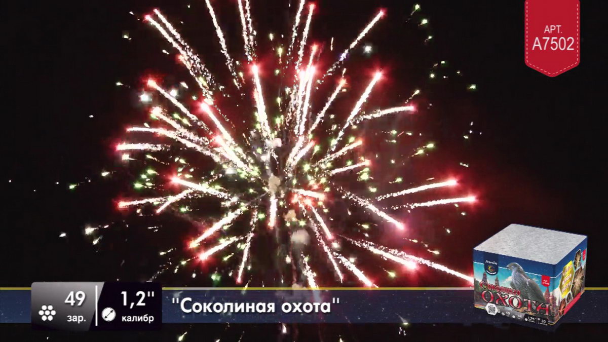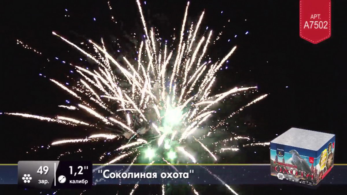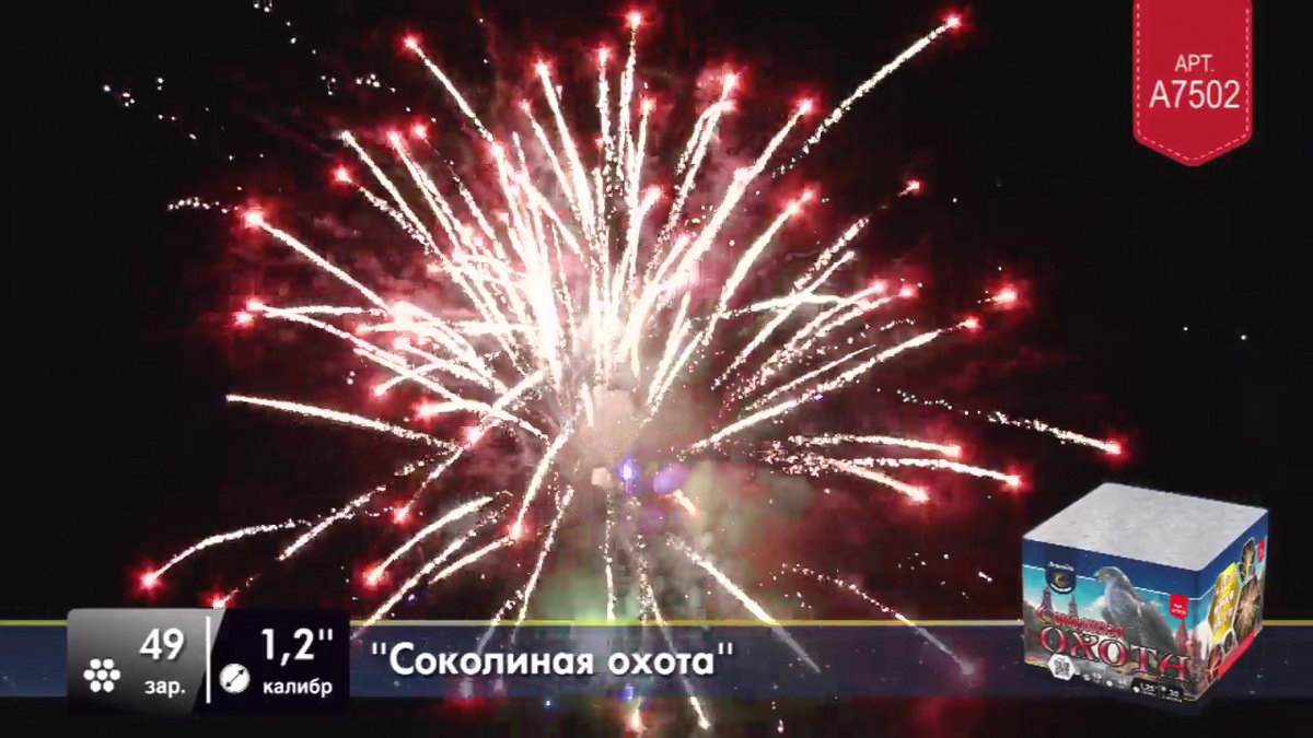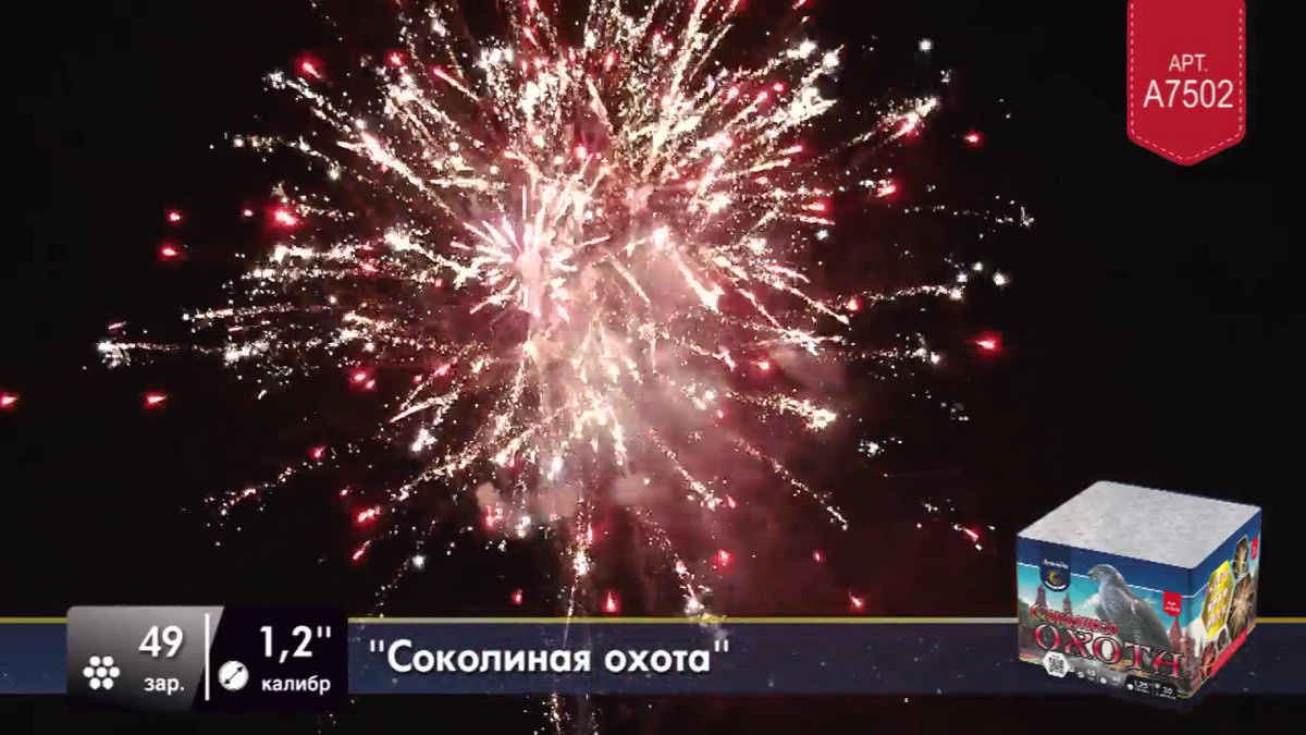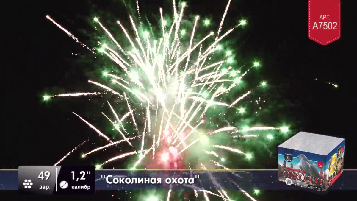 Но сейчас нет необходимости разводить соколов, чтобы получить заряд ярких эмоций. Приобретя фейерверк "Соколиная охота", вы сможете наполнить жизнь восхитительно яркими эмоциями, наблюдая, как ярко-красные звезды разлетаются волнами искр с контрастными зелеными лепестками. Синие ракеты выпускают серебристо-оранжевые мерцающие волны, а после в небе раскрываются пестрящие золотом букеты, увенчанные цветным жемчугом. Завершающий залп раскрывается с треском и мерцанием, расцвечивая небо золотисто-красными пионами.