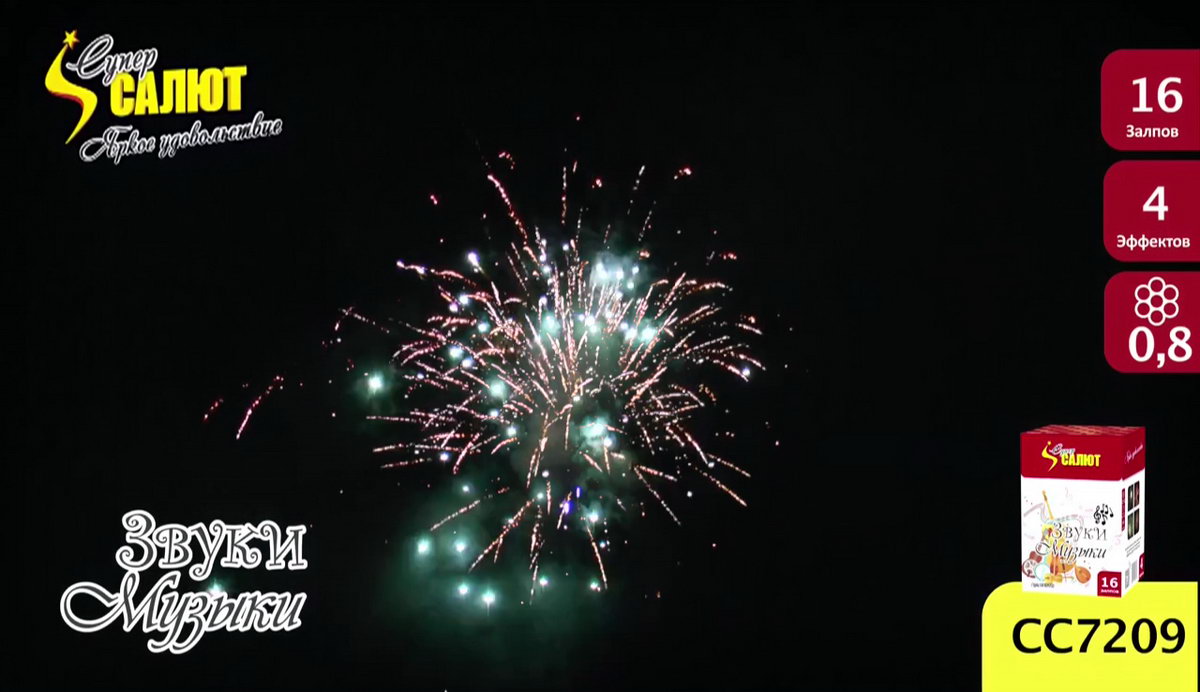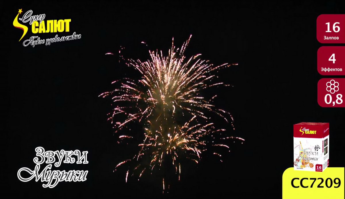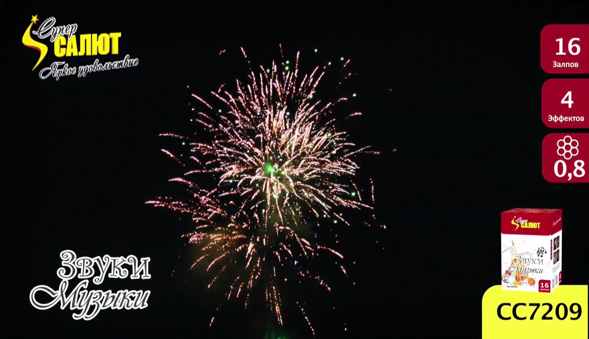Новинка зимы 2014 года - фейерверк "Звуки музыки". Нет, в коробочку с фейерверком не встроен проигрыватель, который будет сопровождать огненное шоу музыкальной композицией. Но с другой стороны... есть ли для любителя салютов музыка приятнее, чем праздничный грохот, треск и взрывы красочных салютных зонтиков? "Звуки музыки" - это сочетание зеленых, красных и фиолетовых звезд и звездных сфер с пышными облаками трещащих золотых искр. Этот фейерверк - отличное доказательство того, что и небольшой по цене и характеристикам салют может быть очень эффектным, если за дело берется настоящий мастер!