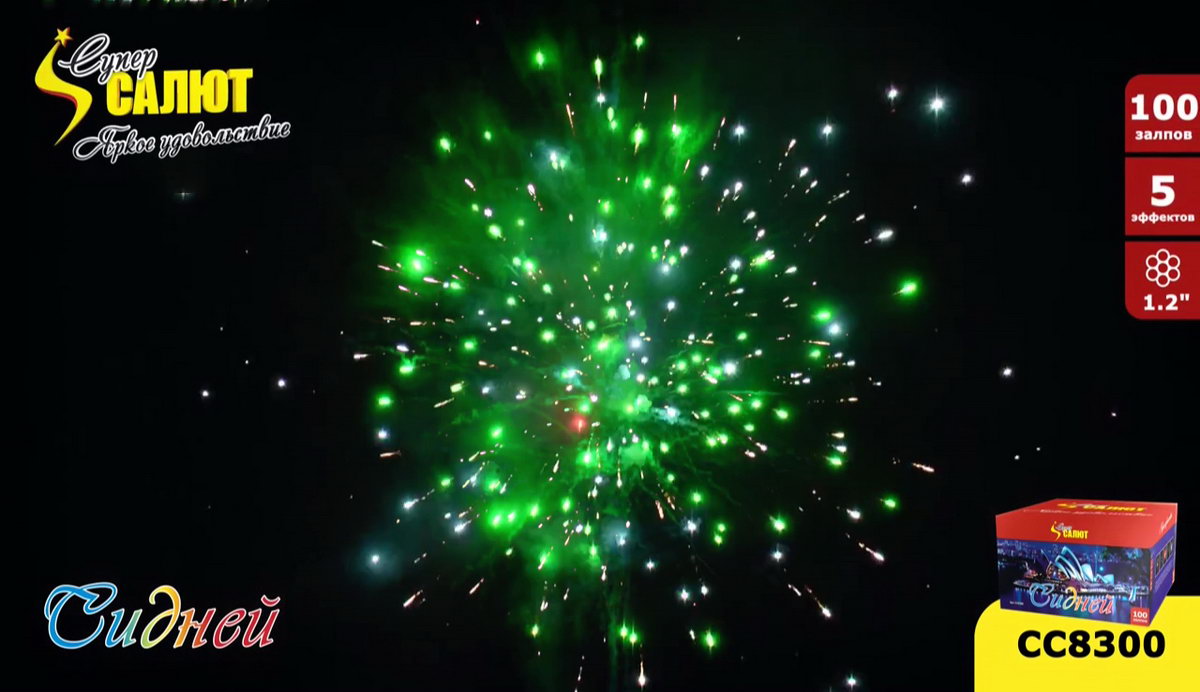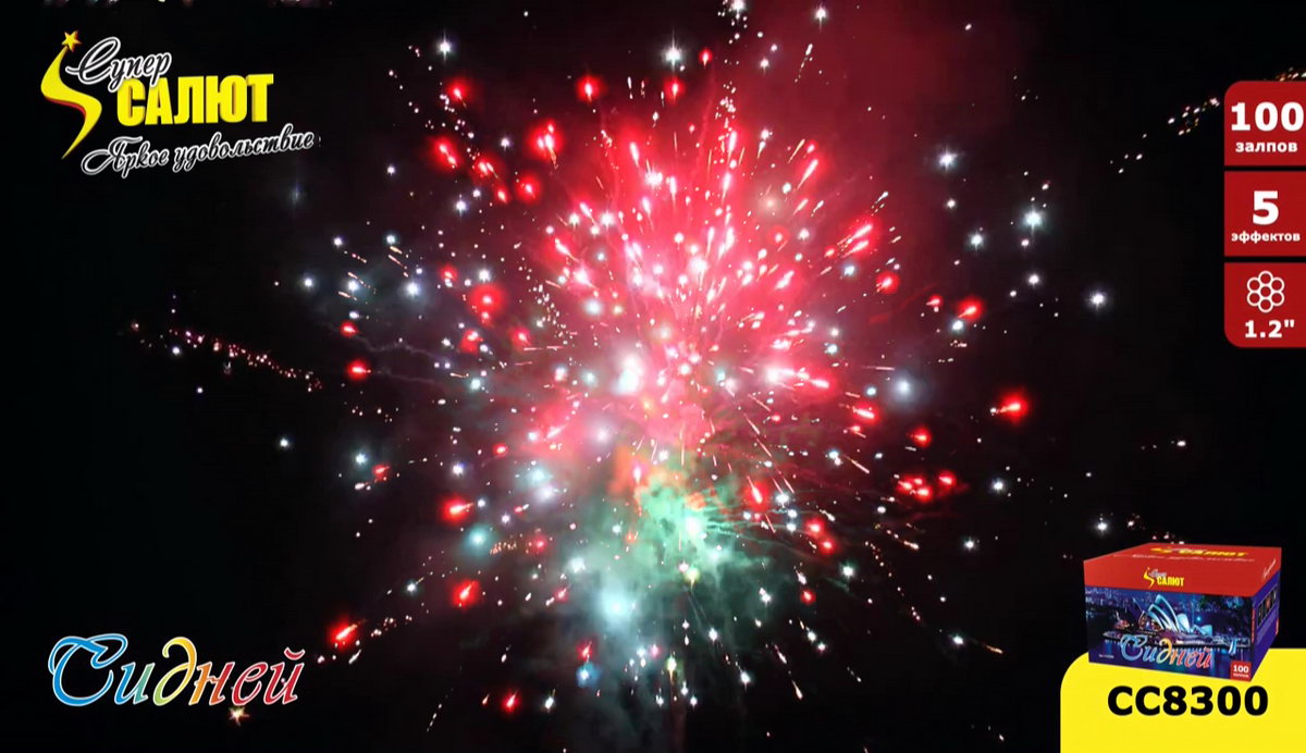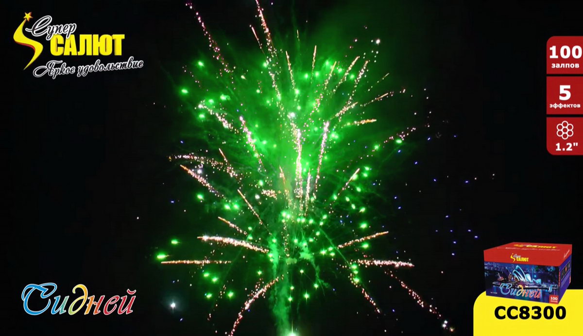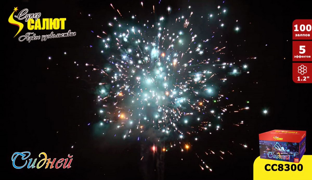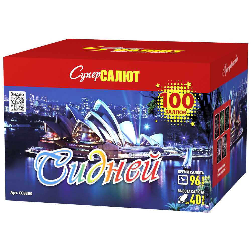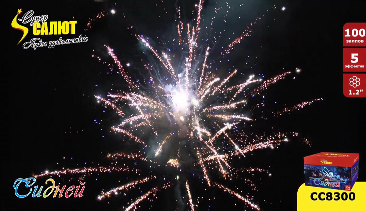 Кто из любителей фейерверков не знает, что австралийская столица Сидней - настоящая Мекка любителей красочных салютов! Фантастическое огненное шоу, которое устраивают австралийцы на Новый год, входит в пятерку самых зрелищных фейрверк-шоу мира. Немножко прикоснуться к этому великолепию Вам поможет новая 100-залповая батарея "Сидней". Этот салют - отличное сочетание лучших на конец 2014 года эффектов! Пушистые кометы разрываются огромными красными, синими, зелеными, белыми пионами с трещащими цветами! Яркие огненные хризантемы создают в небе неповторимый рисунок, сильный финал сопровождается мощным грохотом, проникающим в самое сердце зрителя. Этот салют не оставит ни кого равнодушным. Это Ваш Супер Салют!