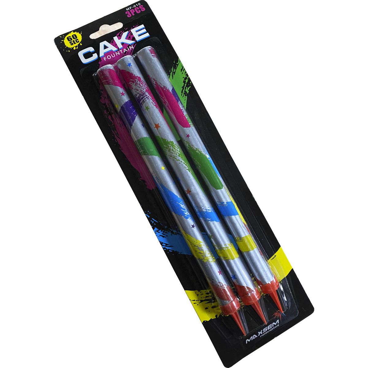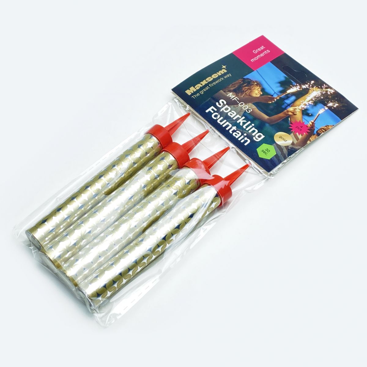 - Другая разновидность холодных фонтанов - фонтаны в торт. Эти миниатюрные изделия снабжены шипом для втыкания в праздничный торт. Фитиля у них нет - поджигать нужно конец фонтана, белую бумажную наклейку. Обратите внимание, что даже в таких мини-фонтанах помимо снопа холодных искр есть открытое пламя - высотой примерно 5-10 см.