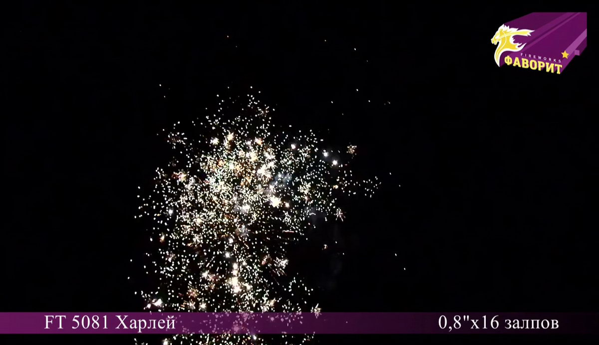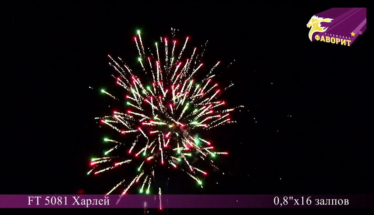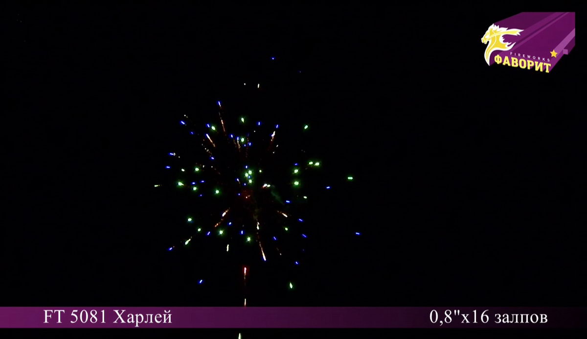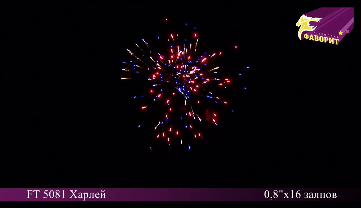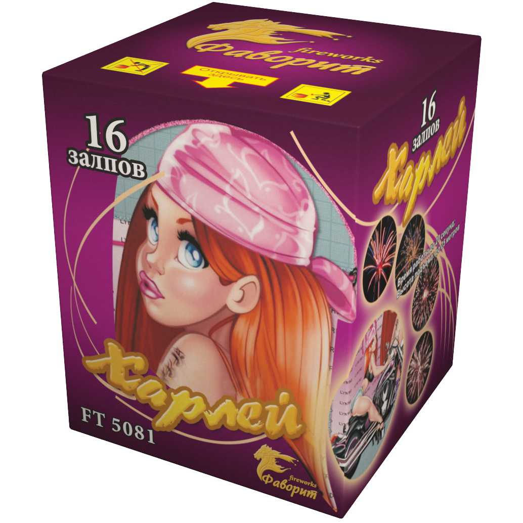 Салют "Харлей" сразу же покоряет симпатичной коробкой с мультяшной девушкой на мотоцикле и не менее симпатичными эффектами. 16 зарядов этого салюта содержат: красно - синие, сине - зеленые пионы