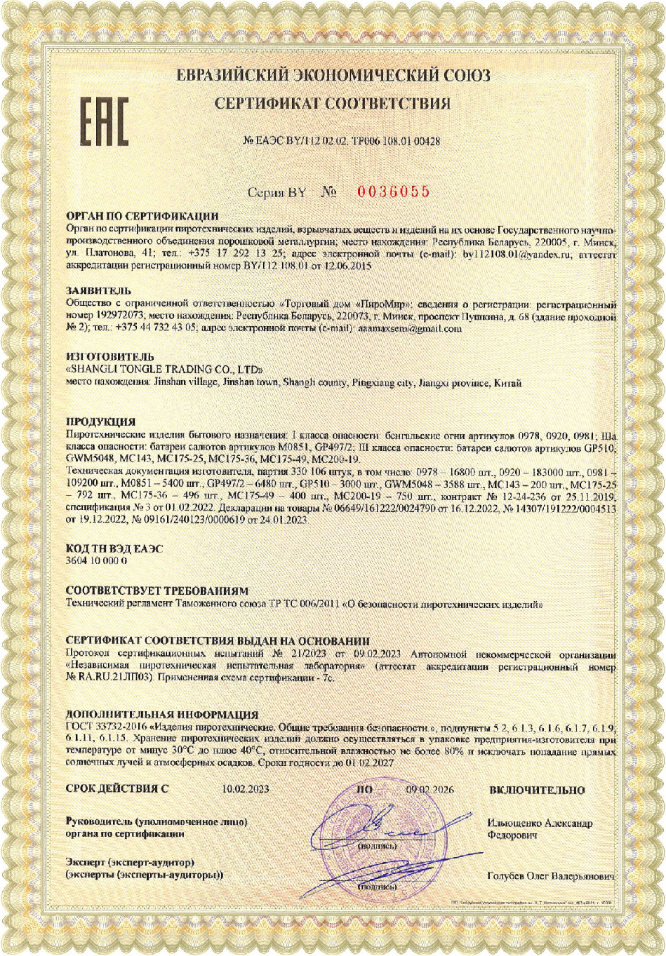 Магазин фейерверков ББ-Салют предоставляет гарантию на весь ассортимент интернет-магазина и розничных магазинов ББ-Салют! Мы торгуем пиротехникой самых лучших, проверенных торговых марок. Все изделия сертифицированы для продажи на территории России и имеют актуальный срок годности.