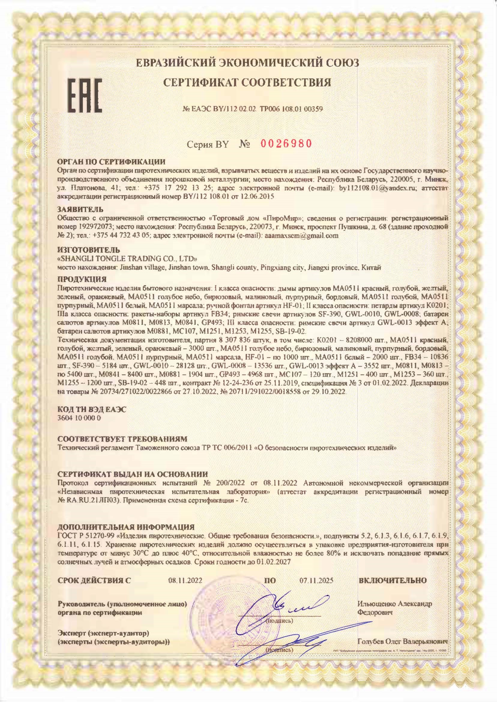 Магазин фейерверков ББ-Салют предоставляет гарантию на весь ассортимент интернет-магазина и розничных магазинов ББ-Салют! Мы торгуем пиротехникой самых лучших, проверенных торговых марок. Все изделия сертифицированы для продажи на территории России и имеют актуальный срок годности.