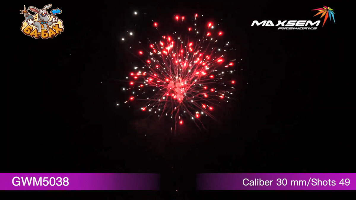 1. Красный пион с серебряным мерцанием. 2. Белые хризантемы с белыми мухами. 3. Золотые пальмы с шипящими звездами, красные и зеленые жемчужины. 4. Тонкие золотистые пальмы с мерцающими искрами и разноцветными звездами. 5. Залп из золотых пальм с серебряным мерцанием.