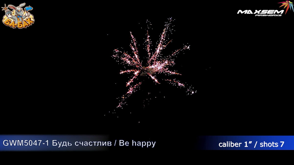 Фейерверк Будь счастлив! - это семь красивых, с треском вылетающих комет, разрывающихся золотой трещащей пальмой на высоте 35 метров. Красивое зрелище будет очаровывать зрителей магией огня, играть всеми красками и удивлять разноцветными искрами, тающими в темном небе. Ярко зазвучит и заликует душа от множества разлетающихся огоньков!