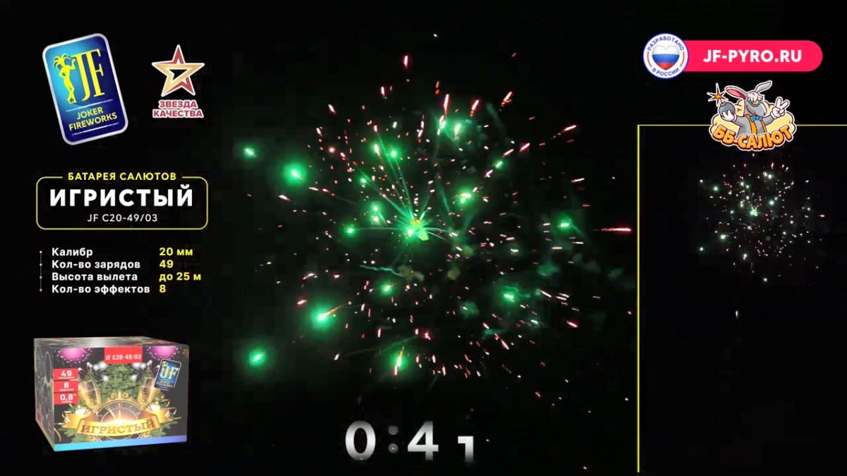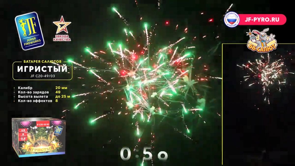 1. Зелёная комета с зелёной волной и белым мерцанием. 2. Фиолетовая комета с фиолетовой волной и белым мерцанием. 3. Синяя комета с 1000 трещащих хризантем и белым мерцанием. 4. Синяя комета с белым мерцанием. 5. Синяя комета с красным мерцанием. 6. Зелёная дахлия с фиолетовыми звёздами и 1000 трещащих хризантем. 7. Синяя комета с белым мерцанием и красной жемчужиной. 8. Зелёная комета с зелёной волной и красным мерцанием.