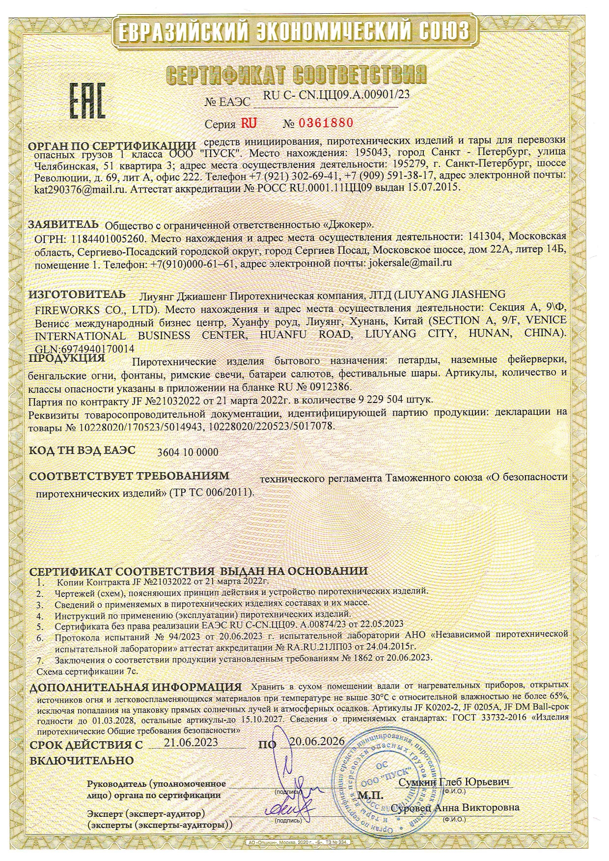 Магазин фейерверков ББ-Салют предоставляет гарантию на весь ассортимент интернет-магазина и розничных магазинов ББ-Салют! Мы торгуем пиротехникой самых лучших, проверенных торговых марок. Все изделия сертифицированы для продажи на территории России и имеют актуальный срок годности.