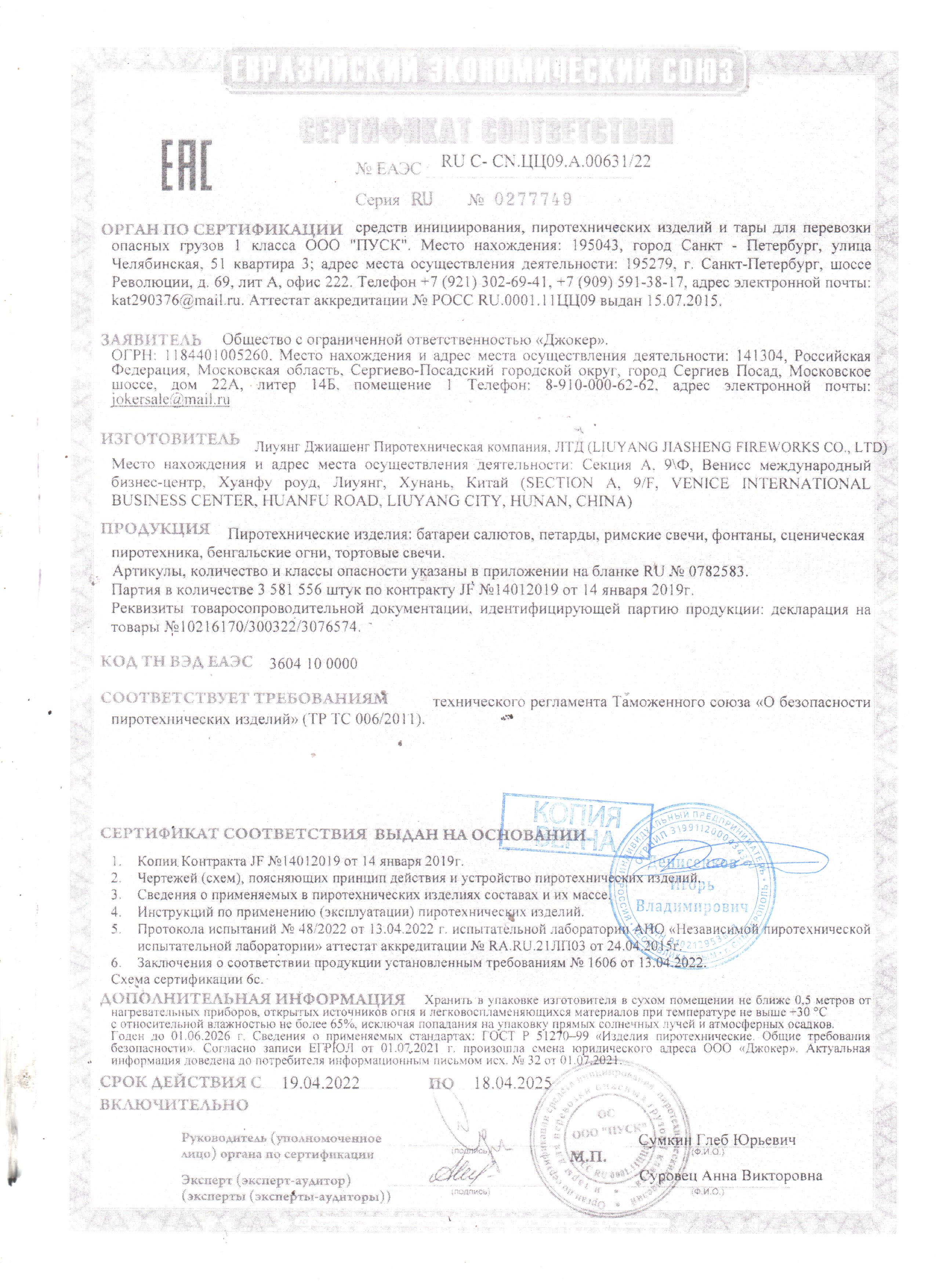 Магазин фейерверков ББ-Салют предоставляет гарантию на весь ассортимент интернет-магазина и розничных магазинов ББ-Салют! Мы торгуем пиротехникой самых лучших, проверенных торговых марок. Все изделия сертифицированы для продажи на территории России и имеют актуальный срок годности.