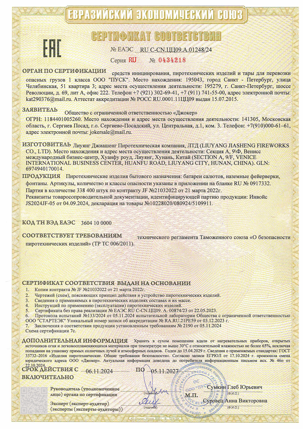 Магазин фейерверков ББ-Салют предоставляет гарантию на весь ассортимент интернет-магазина и розничных магазинов ББ-Салют! Мы торгуем пиротехникой самых лучших, проверенных торговых марок. Все изделия сертифицированы для продажи на территории России и имеют актуальный срок годности.