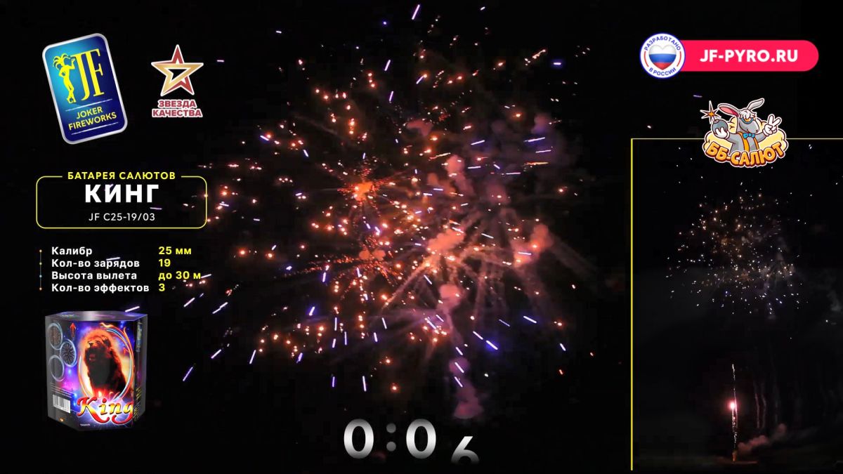 Фейерверк Король - это 19 громких залпов, вылетающих на высоту 25 метров. Здесь всего три эффекта, но они необыкновенно красивые. Друг за другом будут врываться в небо разноцветные кометы и разбрасывать звездочки с зеленым мерцанием. За ними раскроется величественная золотая корона с синими кометами. Такое прекрасное зрелище заставит замирить сердца гостей! В финале в небо взлетят несколько комет, переходящих в яркое золотое мерцание, медленно гаснущее на вечернем небе.