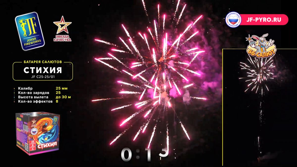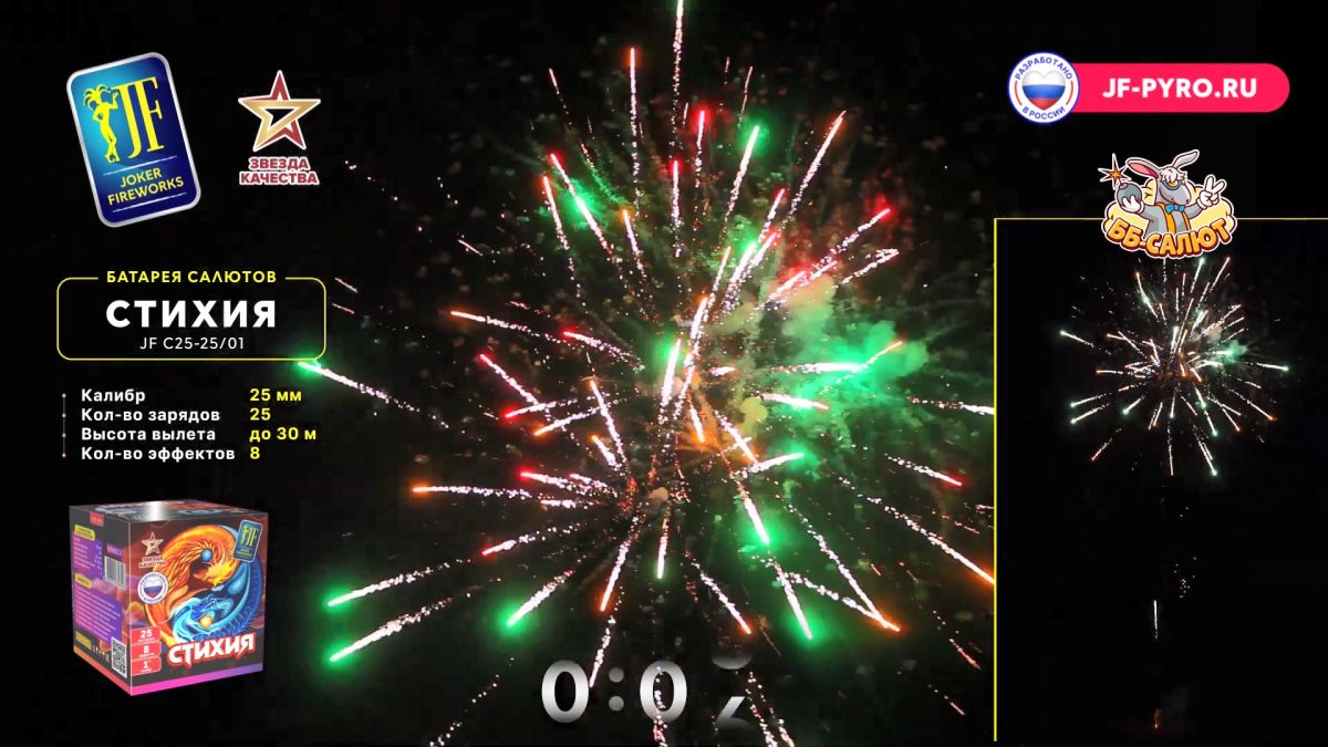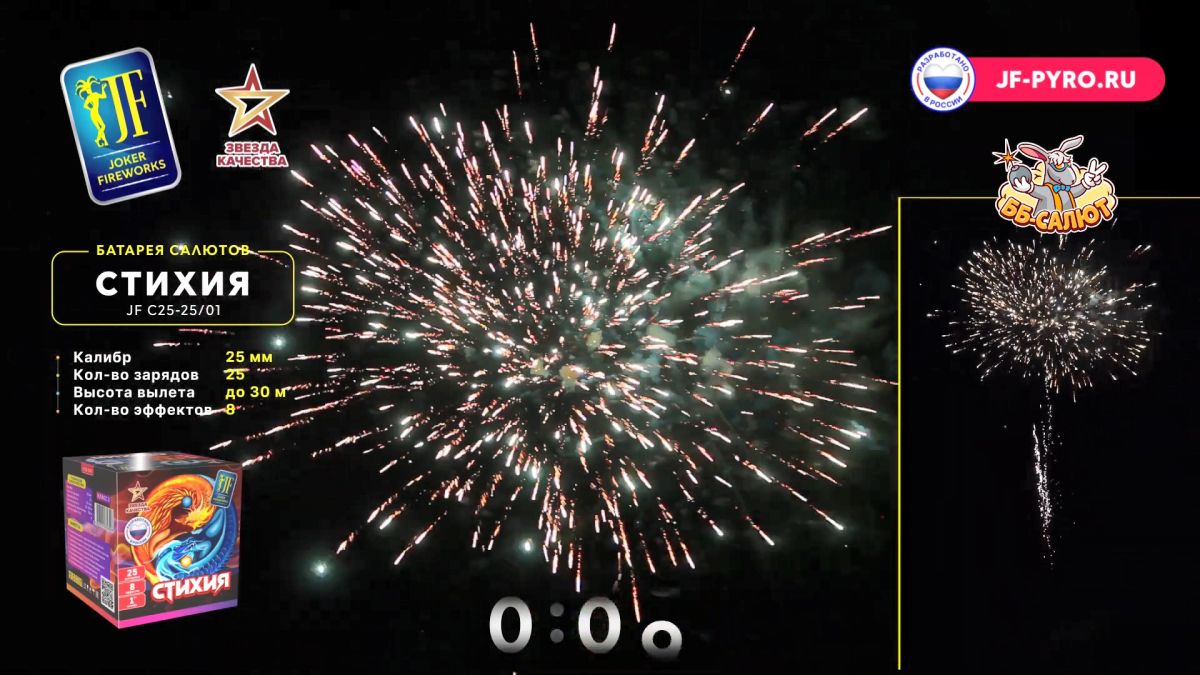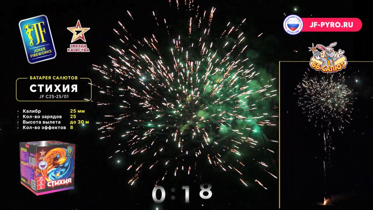 Красивое огненное представление Стихия развернется на высоте 25 метров. Двадцать пять комет раскроют на вечернем небе семь красочных эффектов, а здесь собраны все самые любимые зрителями. Перед вами появятся красные и разноцветные волны, сопровождающиеся веселым треском. Раскроются белые и пурпурные пионы, взметнутся ввысь разноцветные салюты с красным и белым мерцанием. В разгаре шоу к ним присоединится великолепный золотой салют с искрометным треском. Игра стихийных красок и огней закончится завораживающим финалом - на небе появится пышный купол, опадающий прямо на зрителя.