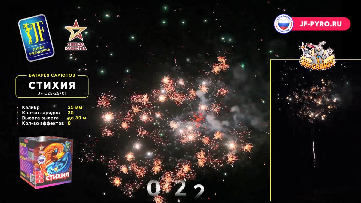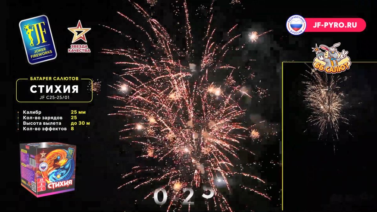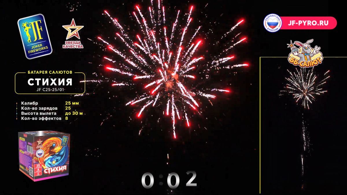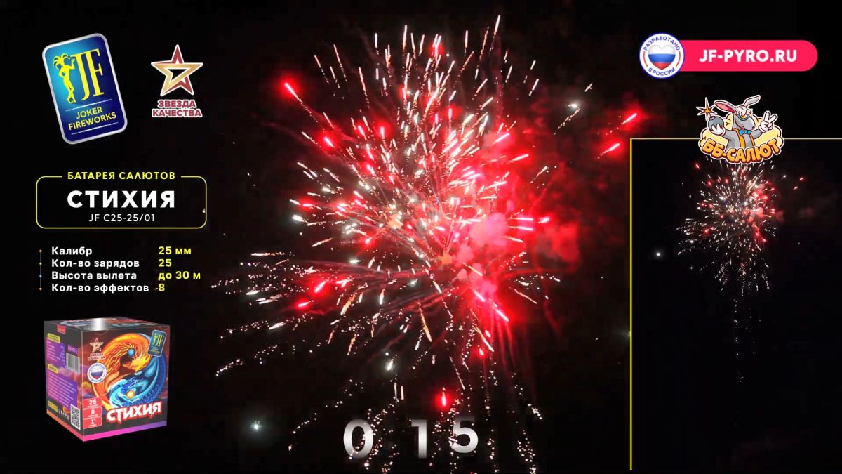 Красивое огненное представление Стихия развернется на высоте 25 метров. Двадцать пять комет раскроют на вечернем небе семь красочных эффектов, а здесь собраны все самые любимые зрителями. Перед вами появятся красные и разноцветные волны, сопровождающиеся веселым треском. Раскроются белые и пурпурные пионы, взметнутся ввысь разноцветные салюты с красным и белым мерцанием. В разгаре шоу к ним присоединится великолепный золотой салют с искрометным треском. Игра стихийных красок и огней закончится завораживающим финалом - на небе появится пышный купол, опадающий прямо на зрителя.